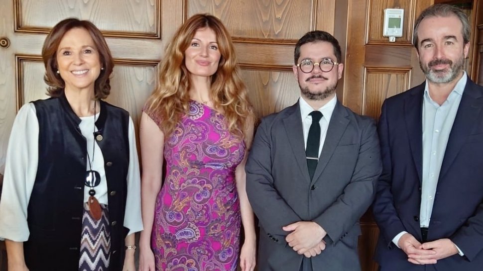 La vicerrectora de Ordenación Académica y Profesorado de Uneatlántico, Silvia Aparicio, junto al director de la ORI, Juan Luis Vidal, y el director de Fidban y profesor de la universidad, Diego Lainz, se reunieron con el embajador de Chile en España, Javier Velasco, y la directora de la Fundación Chile-España, María Ángeles Osorio.
