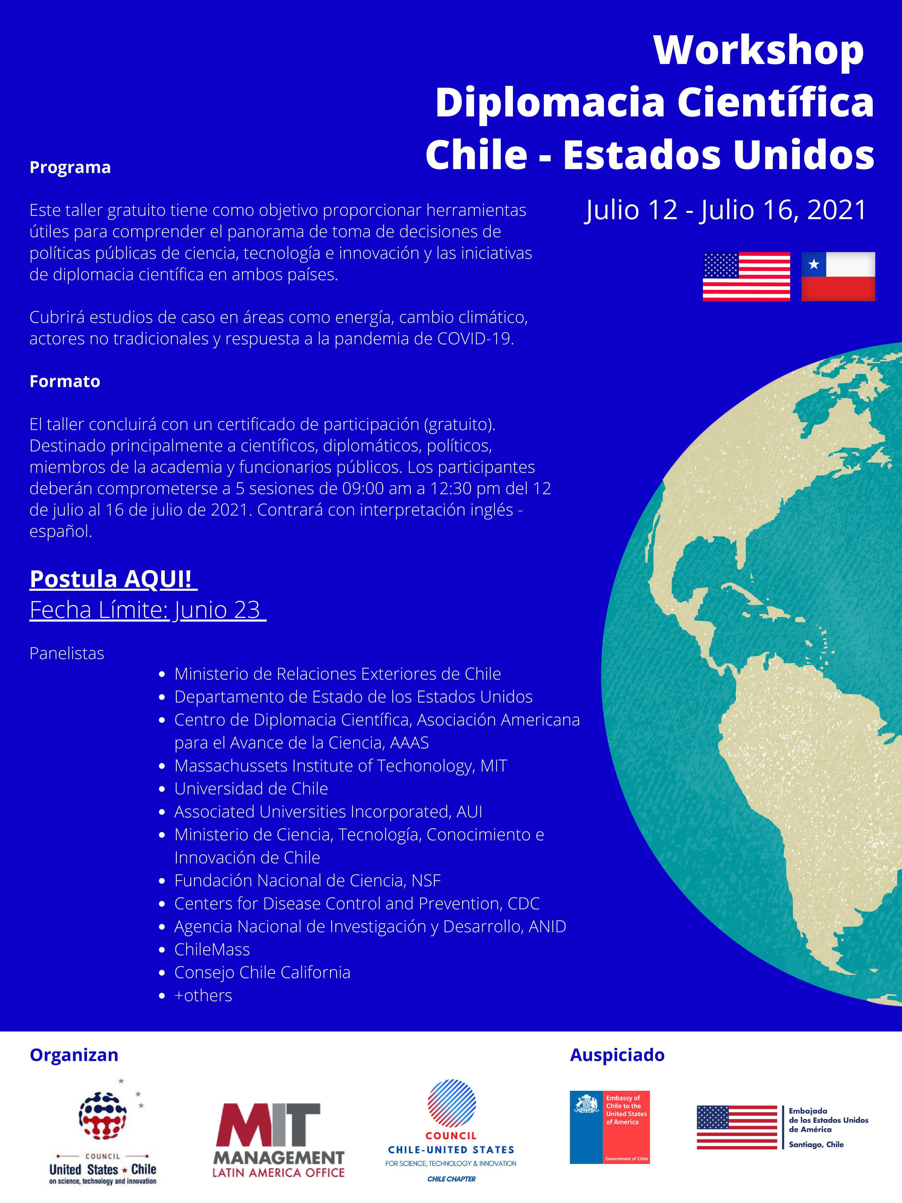 La Embajada de Chile en Estados Unidos, junto a MIT Sloan Latin American Office y la Embajada de Estados Unidos en Chile te invitan a postular al taller gratuito abierto a público sobre diplomacia científica Chile- EEUU a realizarse entre el 12 y 16 de julio entre 9:00 a 12:30 am.