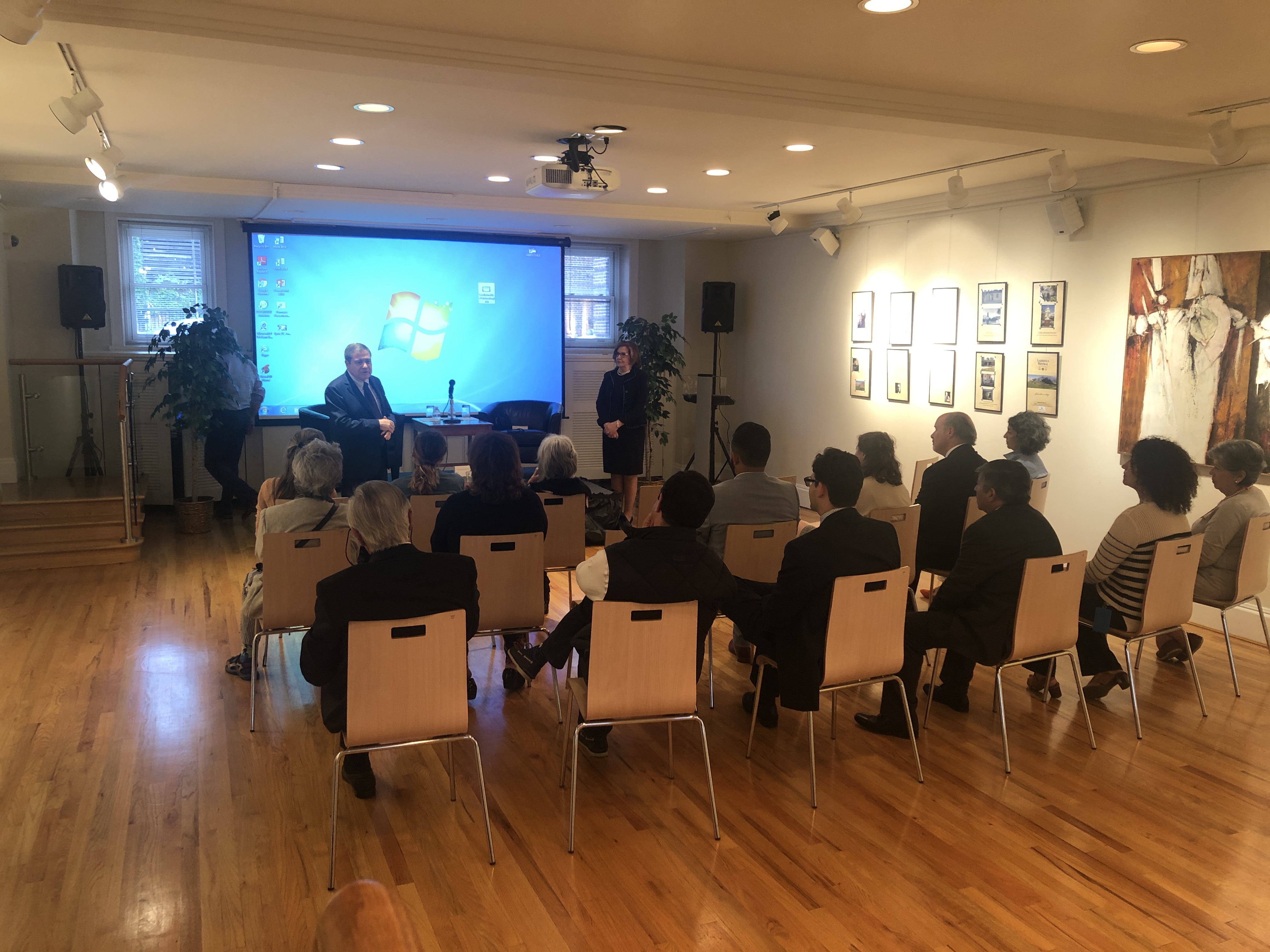 En el conversatorio, la presidenta de Gabriela Mistral Foundation, Gloria Garafulich, junto a el Agregado Cultural de Chile en Estados Unidos, Jorge Canelas, comentaron distintos aspectos de la chilena ganadora del Premio Nobel de literatura en 1945.