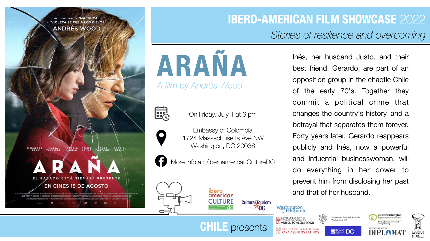 Este 1 de julio, se presentó en la sala de cine de la embajada de Colombia en Washington DC, la película chilena "Araña" dirigida por el destacado director Andrés Wood. La proyección se realizó en el marco del Ciclo de Cine Iberoamericano 2022 "Historias de resiliencia y superación", organizado por la Asociación Iberoamericana de Agregados Culturales. La programación especial se realiza en formato presencial y virtual y cuenta con la colaboración de la Oficina de la Alcaldía de DC.