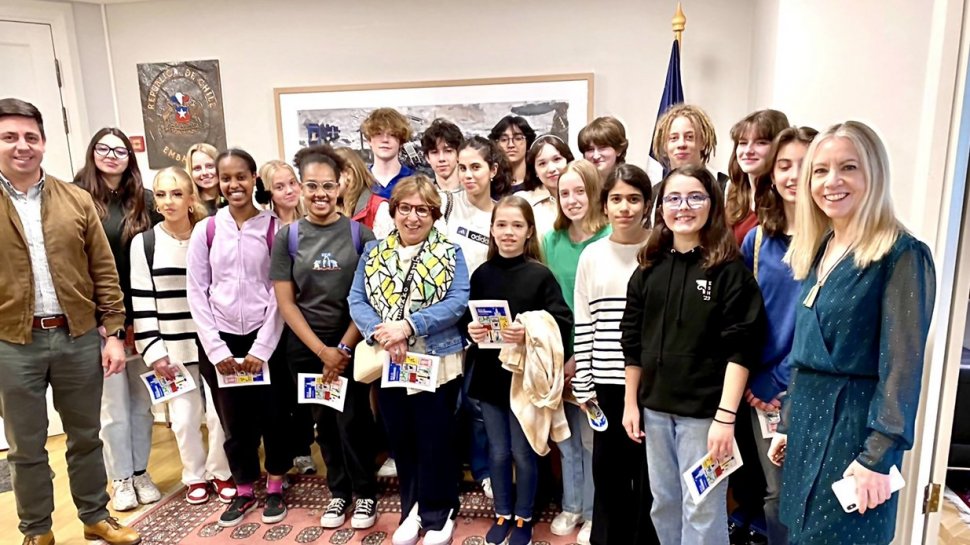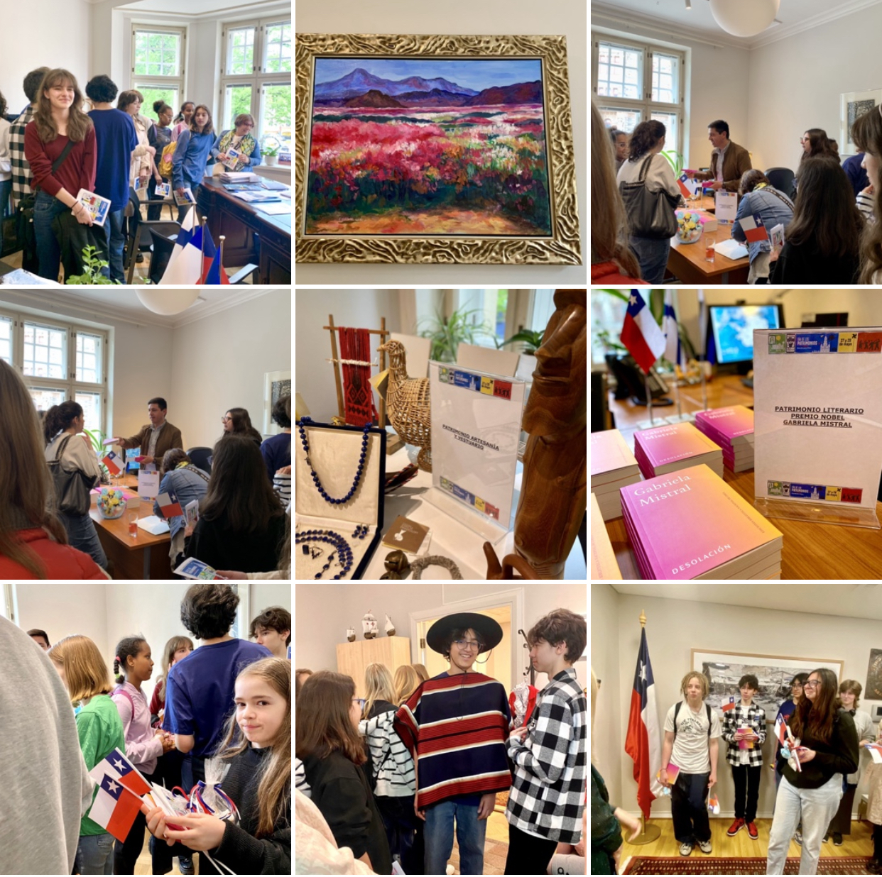 La Embajada de Chile en Finlandia celebró el Día de los Patrimonios 2023 con una visita guiada a veinte estudiantes del Colegio Europeo de Helsinki y su profesora chilena, Manuela Solís, quienes recorrieron las dependencias, acompañados por la Embajadora y el personal diplomático y local.