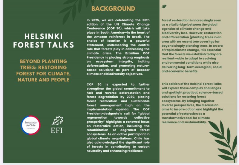El 12 de mayo de 2025, la Embajada de Chile en Finlandia organizó el seminario “Helsinki Forest Talks: Más allá de plantar árboles: Restaurando bosques para el clima, la naturaleza y las personas”, en colaboración con el Instituto Europeo de Bosques (EFI) y como parte del Programa de Actividades Específicas en el Exterior.