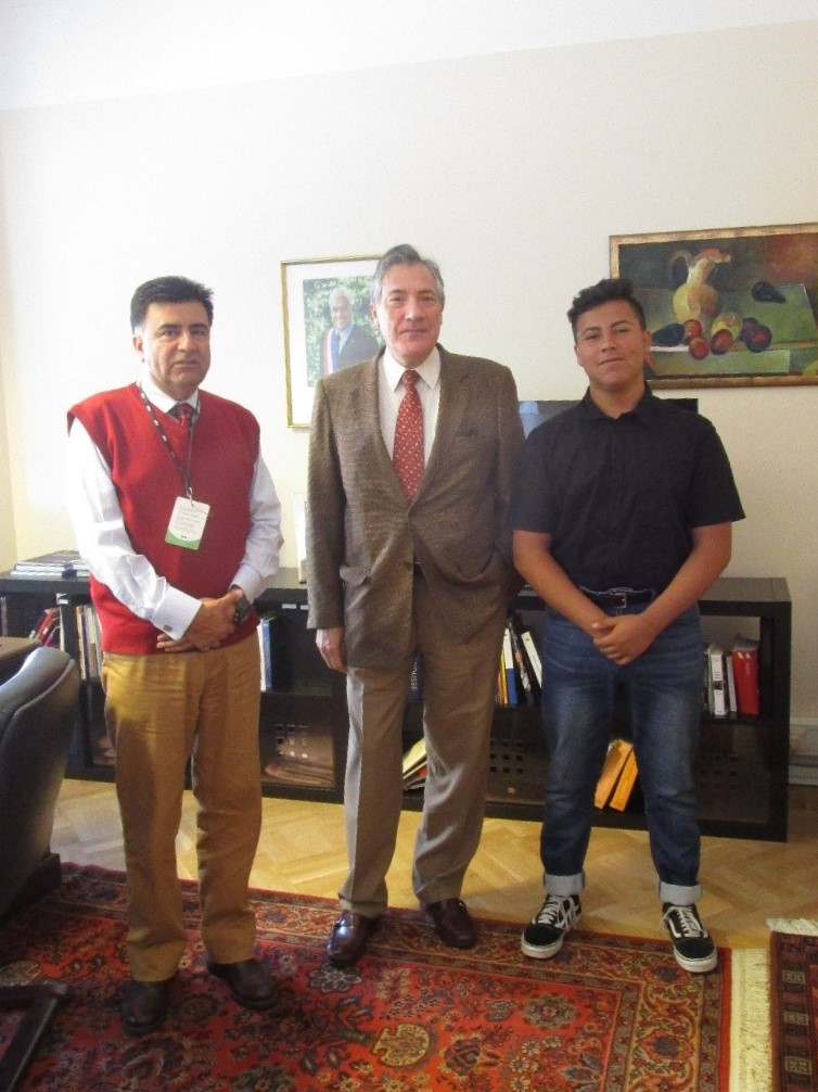 El día de clausura de esta conferencia tuvimos la oportunidad de recibir en la Embajada al profesor Roberto Parra y al estudiante Felipe Villablanca, quienes manifestaron su alegría por representar a Chile en este foro global, demostrando un gran compromiso por combatir el cambio climático y compartir esta experiencia con sus compañeros.