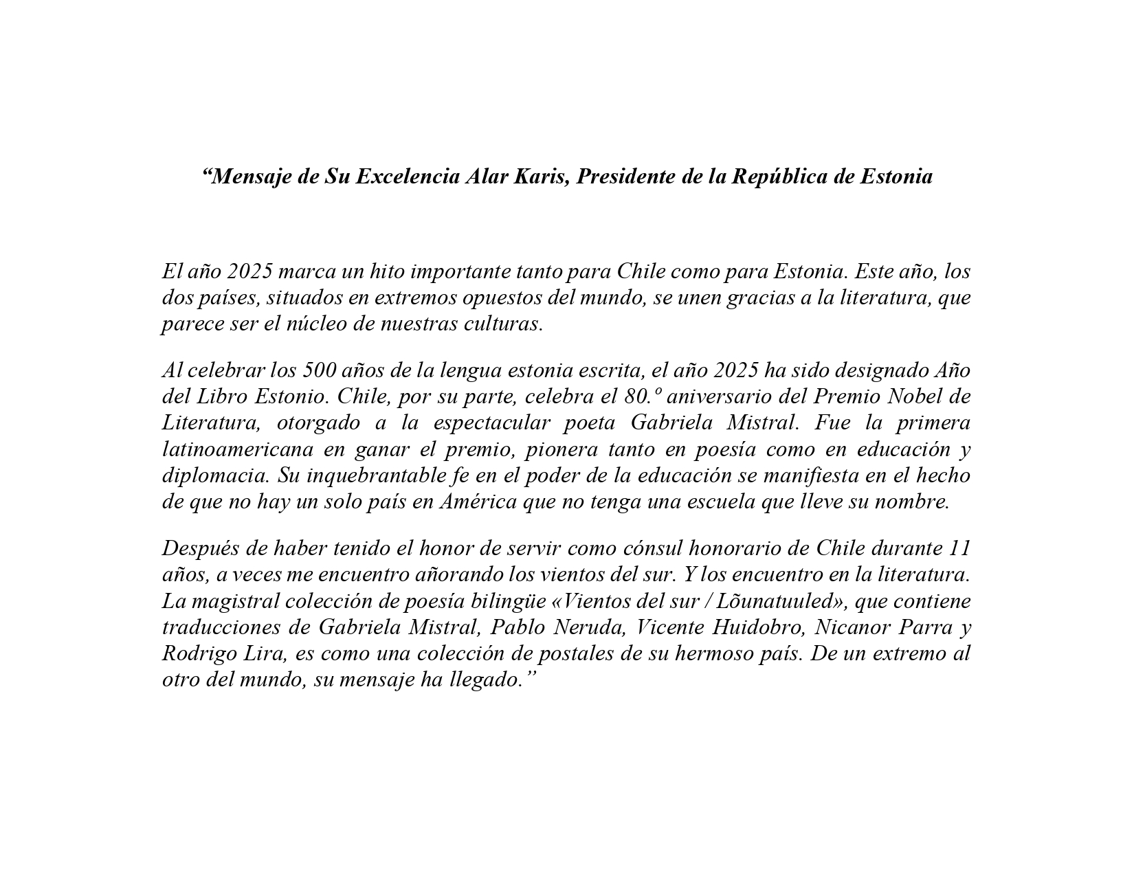 En su mensaje, el Presidente Alar Karis, quien durante 11 años ejerció como Cónsul Honorario de Chile en la ciudad de Tartu, antes de asumir la principal magistratura de su país, transmite su afecto y admiración por Chile, reconociendo el aporte cultural de Gabriela Mistral a nuestro país como una “poetisa espectacular” y una líder en la literatura, la educación y la diplomacia.