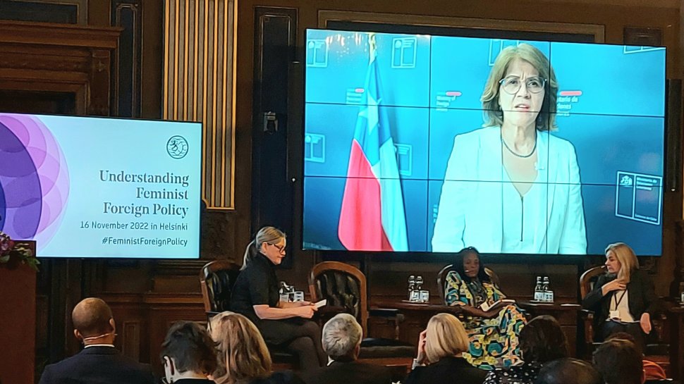 El miércoles 16 de noviembre de 2022, la subsecretaría de Relaciones Exteriores, Ximena Fuentes, participó virtualmente en la “Conferencia de Alto Nivel para Avanzar en la Igualdad de Género a través de Políticas Exteriores Feministas”, organizada por el Ministerio de Relaciones Exteriores de Finlandia, como parte del panel titulado “Women as foreign policy makers and peacebuilders”.