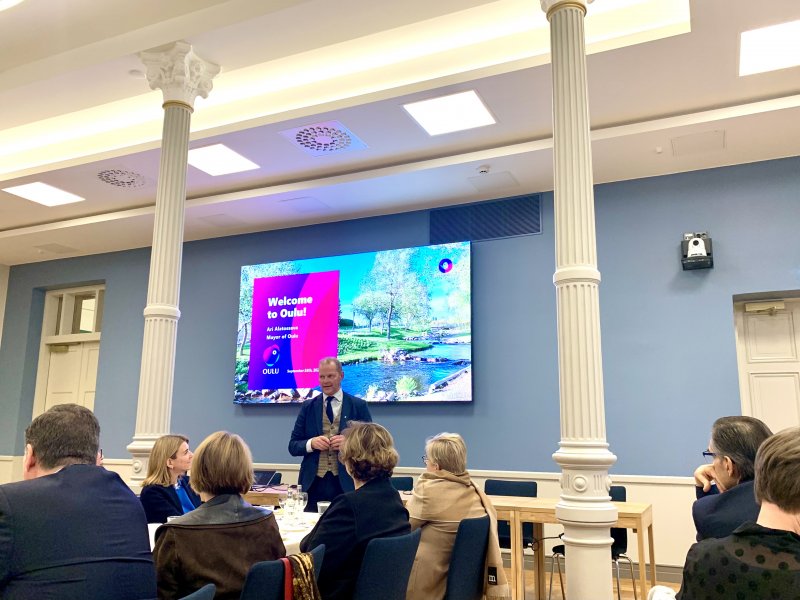 La embajadora Belén Sapag participó en el programa de actividades que contempló, la reunión con el alcalde de Oulu, Ari Alatossava, Mirja Vehkaperä, presidenta de la junta municipal, y Outi Rouru, jefa de relaciones internacionales, realizada en la reciente remodelada sede del municipio, oportunidad en que dichas autoridades se refirieron a las prioridades de la ciudad, próxima capital europea de la cultura.