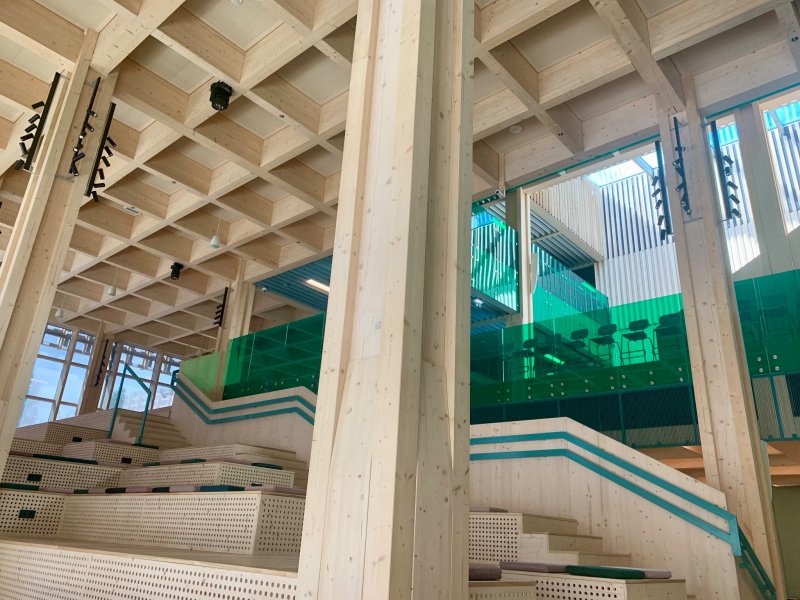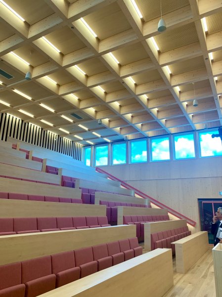 La embajadora recorrió, acompañada por el director Indrek Lillemägi, las dependencia del moderno edificio, construido en base a un diseño que conjuga el espacio, la luz y los materiales naturales del país como la madera. El recinto tiene salas modulares amplias y abiertas que fomentan la integración y la participación, biblioteca y comedores con árboles y vegetación interiores, recordando el compromiso con la sustentabilidad.