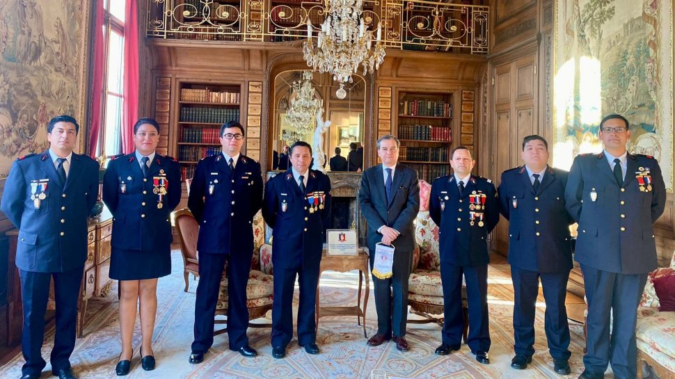 El embajador Raúl Fernández se reunió el 30 de noviembre con una delegación de ocho voluntarios de la Quinta Compañía Pompe France de Chillán, encabezada por su director Marcelo Vásquez.