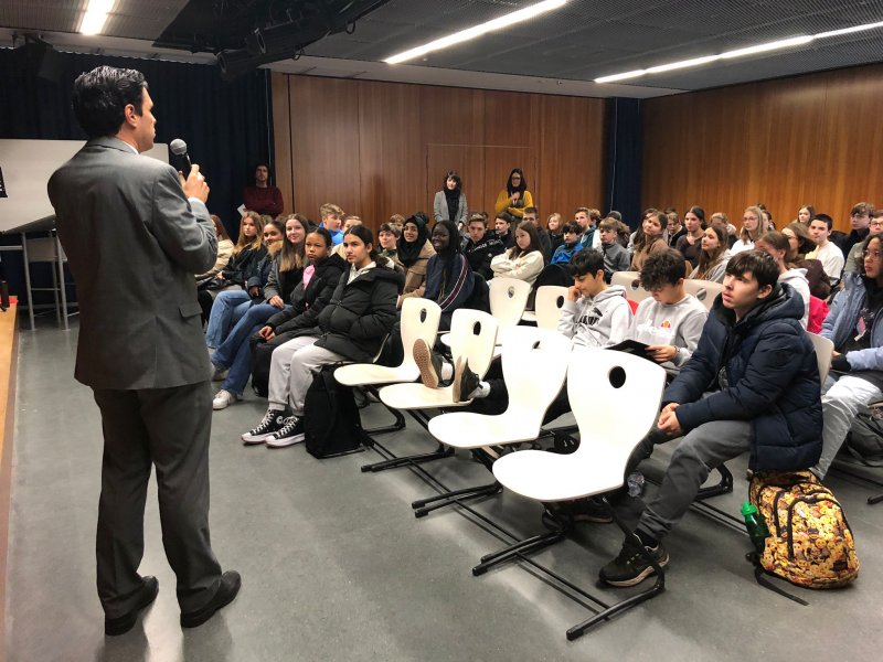 En la instancia, el Cónsul realizó una presentación en este establecimiento a alumnos de la octava clase. En esta actividad se mencionó información general de Chile, geografía mundial y regional, cultural y social; y, asimismo, el trabajo cultural del Consulado en la entrega de libros en castellano en la región de Hesse y sobre los principales autores nacionales. Este diálogo resultó de toda utilidad para los asistentes, quienes formularon diversas e interesantes preguntas sobre nuestro país y sobre la carrera diplomática.