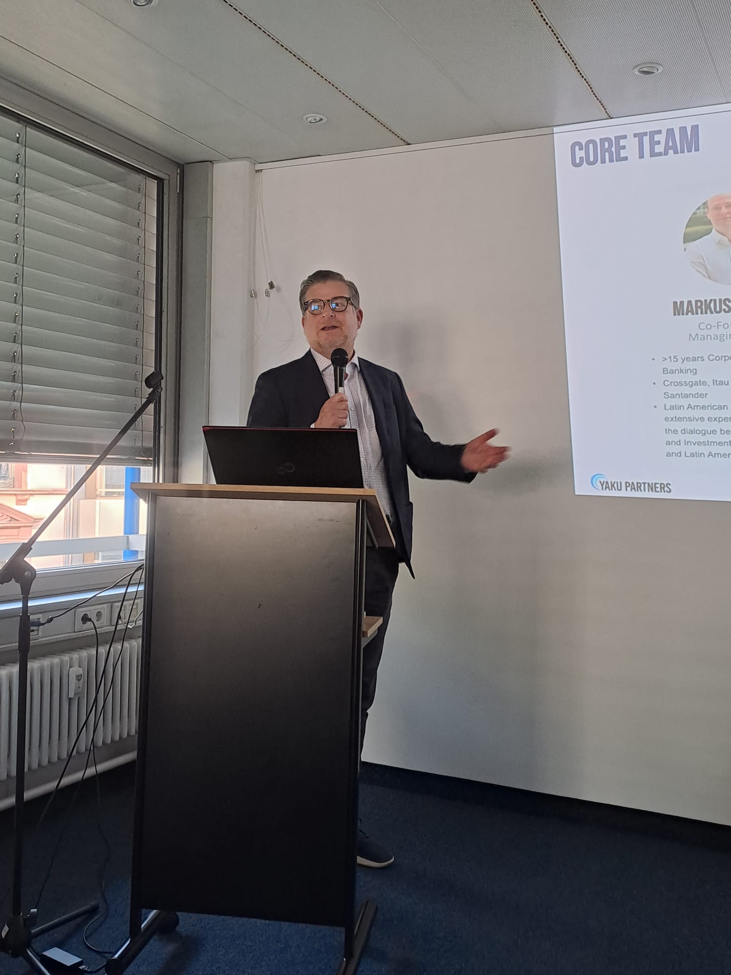 Por parte de Chile tomaron parte el Sr. Klaus Hübner quien presentó Yaku Partners y posteriormente, el Cónsul Francisco Mackenney aludió a la estructura institucional en Alemania, a través de la Embajada, los Consulados, Prochile Alemania, Invest Chile y la instalación del Agregado Tecnológico, Sr Francisco Orozco quien también participó en este evento y saludó a los asistentes.