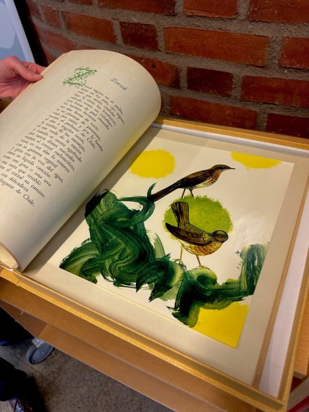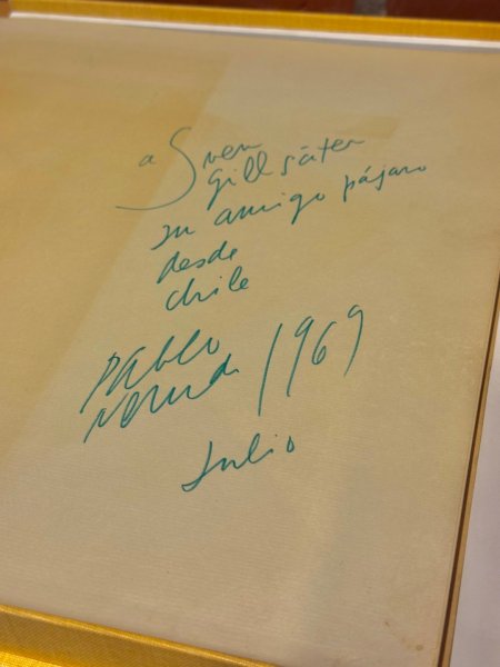 Concluida la actividad, la Biblioteca de Humanidades de la Universidad expuso al embajador de Chile en Suecia, Tucapel Jiménez Fuentes; y a nuestro cónsul general en Gotemburgo, Manuel José Saldías, entre otras personas, una vitrina con las fotografías originales proyectadas durante el concierto de piano, que registran el paso de Gabriela Mistral por Mårbacka, Suecia, donde se reunió con otras intelectuales, como Elin Wägner o Eva Andén. Además se exhibió un ejemplar único del libro “Arte de Pájaros” de Pablo Neruda, ilustrado por Mario Toral y Nemesio Antúnez, entre otros; y firmado por el vate chileno.