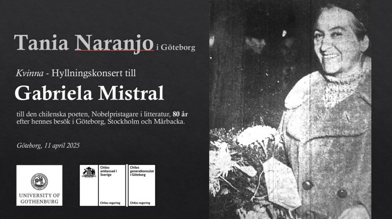 El viernes 11 de abril de 2025 el consulado general tuvo el honor de convocar junto a la Universidad de Gotemburgo y a la Embajada de Chile en Sueca a un memorable concierto tributo de piano a Gabriela Mistral, de manos de la destacada compositora chileno-sueca residente en Malmö, Tania Naranjo, en el auditorio de la Facultad de Humanidades de la Universidad de Gotemburgo.