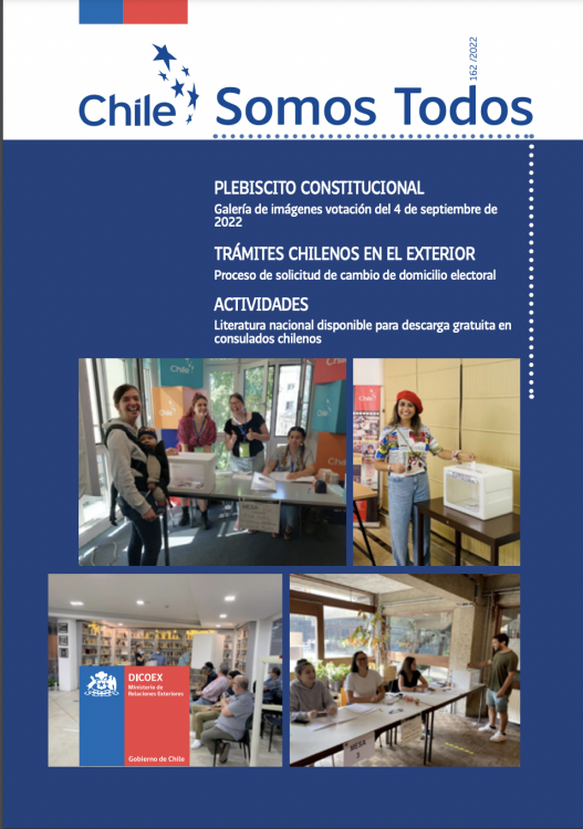Se informa a la comunidad que ya se encuentra disponible en el sitio web www.chilesomostodos.gob.cl, la revista digital “Chile Somos Todos" N° 162, dirigida a nuestros connacionales residentes en el mundo.