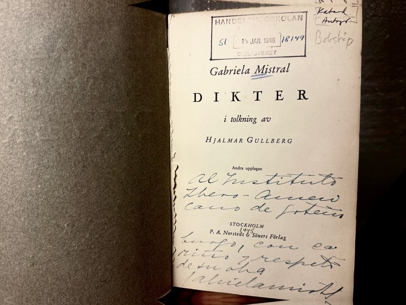 En su dedicatoria, se lee lo siguiente: "Al Instituto Ibero-Americano de Gotemburgo, con cariño y respeto de su obra / Gabriela Mistral".