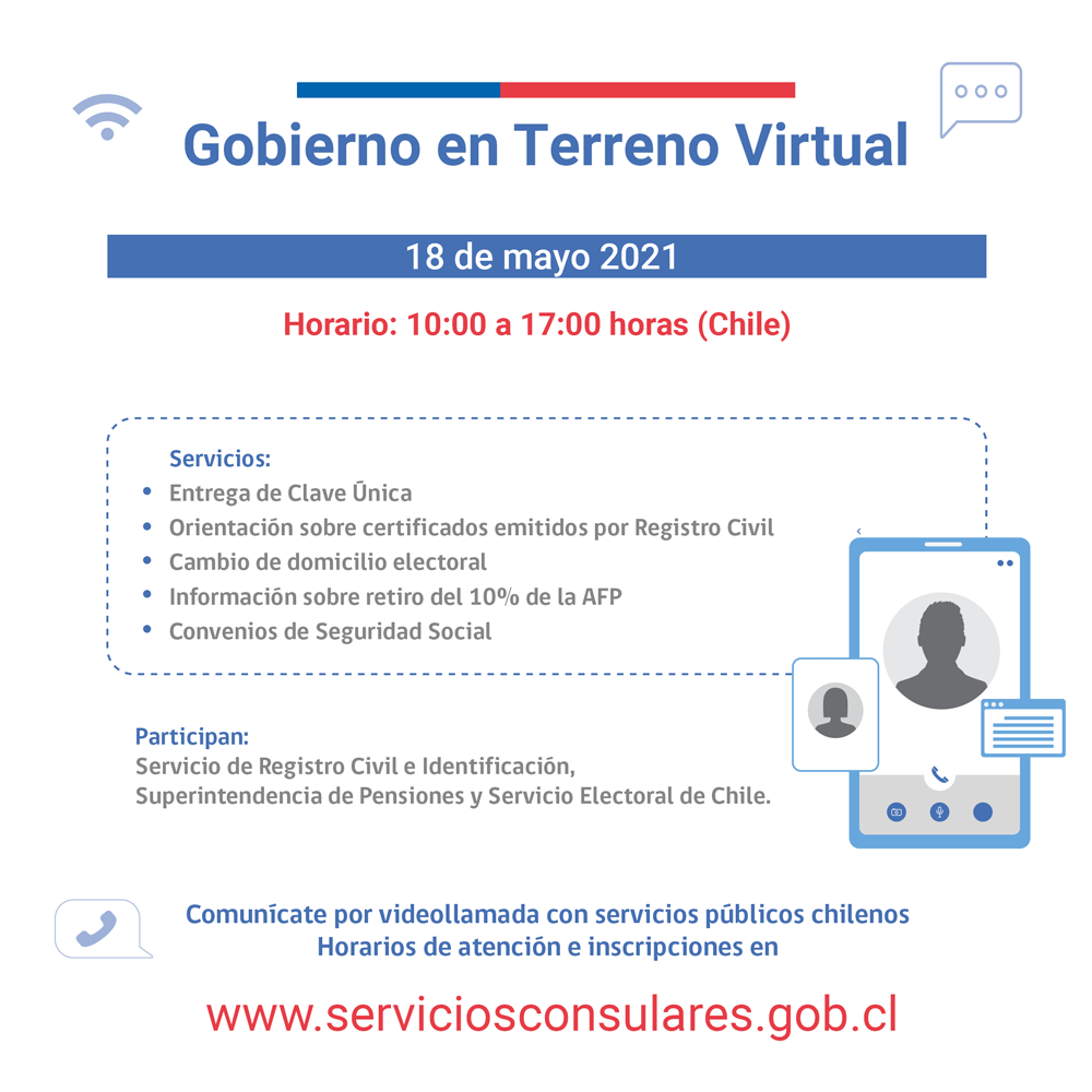 3) En relación al punto 2 anterior, se informa a la comunidad chilena residente que se ha abierto un "Gobierno en Terreno Virtual", para que aquellos connacionales en el exterior puedan solicitar el cambio de su domicilio electoral en forma remota, sin acudir a este Consulado General en Gotemburgo. Mayor información sobre esta actividad puede ser consultada en el sitio web www.serviciosconsulares.gob.cl.