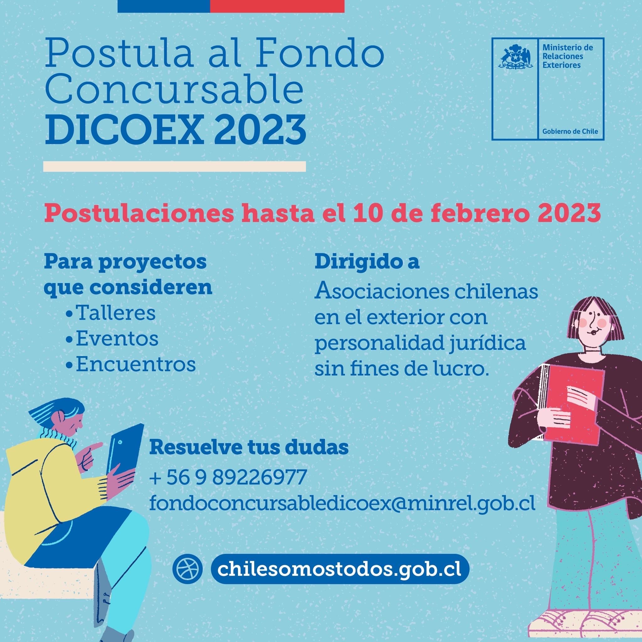 Mayor información, en: https://www.chilesomostodos.gob.cl/chilesomostodos/noticias/enero-2023/fondo-concursable-dicoex-abre-convocatoria-2023