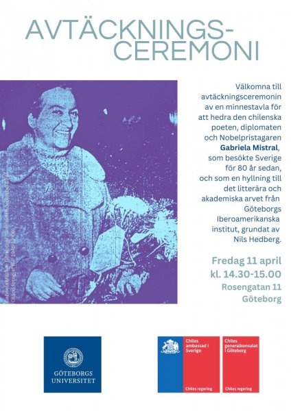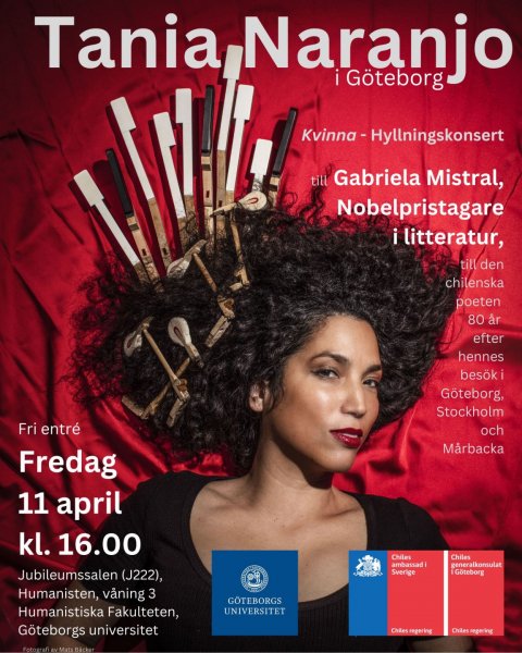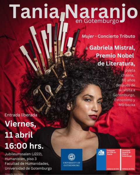El Consulado General de Chile en Gotemburgo, en conjunto con la Embajada de Chile en Suecia y la Universidad de Gotemburgo, tiene el honor de extender a la comunidad una invitación a la ceremonia oficial de develación de una placa conmemorativa en recuerdo de la ilustre visita de Gabriela Mistral a Gotemburgo, 80 años atrás, en su camino a recibir el Premio Nobel de Literatura y a un concierto tributo a la poetisa elquina, de la pianista residente, Tania Naranjo.