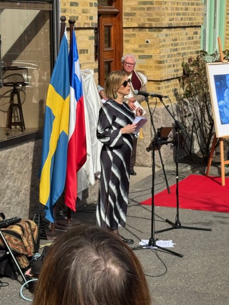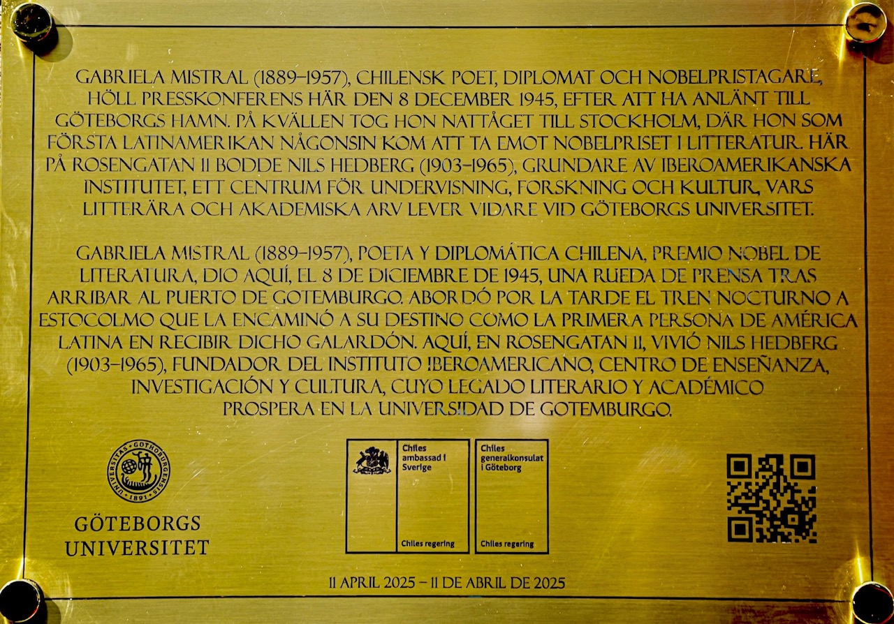 El viernes 11 de abril de 2025, realizamos en la dirección Rosengatan 11 de Gotemburgo la ceremonia oficial de descubrimiento de una placa conmemorativa en homenaje a nuestra célebre poeta Gabriela Mistral, quien visitó el lugar un 8 de diciembre de 1945 en su paso por esta ciudad para recibir el Premio Nobel en Estocolmo, dos días después.