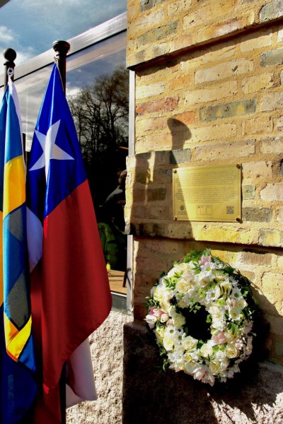 La emotiva ceremonia concluyó con el descubrimiento de la placa, patrocinada por la Universidad de Gotemburgo, la Embajada de Chile en Suecia y nuestro Consulado General en Gotemburgo. Cuenta asimismo con un código-QR que la vincula al proyecto literario sueco “Litteraturbanken”. La idea de una placa fue concebida por el Bibliotecario de Humanidades de la universidad, Joakim Lilljegren, inspirado en el trabajo de investigación de la bibliotecaria y doctora honoris causa, Anna Svensson.