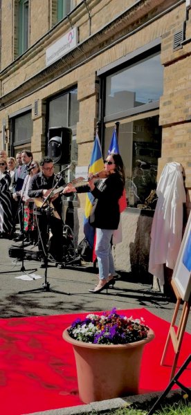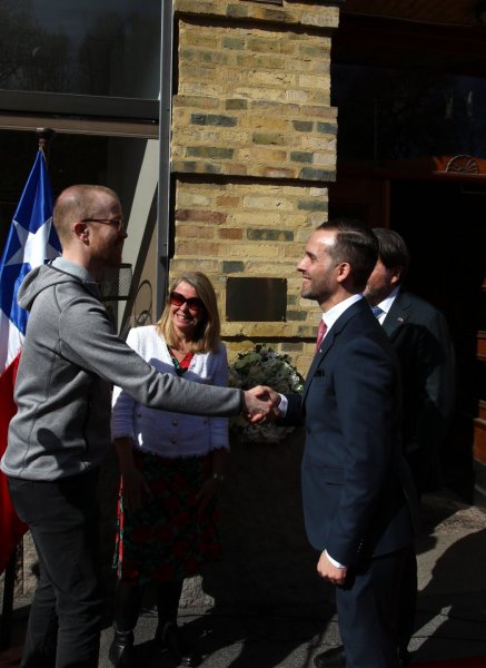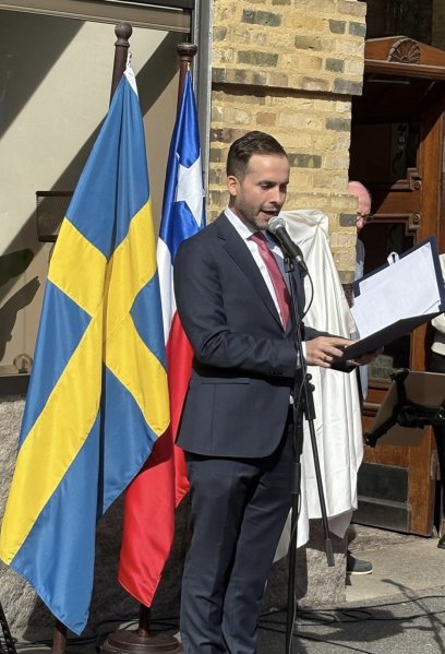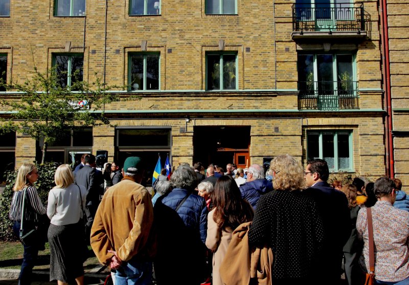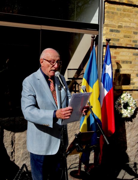La ceremonia contó con las solemnes palabras de la rectora de la Universidad de Gotemburgo, Malin Broberg; del embajador de Chile en Suecia, Tucapel Jiménez Fuentes; de nuestro cónsul general en Gotemburgo, Manuel José Saldías; y de la vicedecana de la Facultad de Humanidades de la universidad, Andrea Castro; incorporándose espontáneamente con unas palabras el vecino del edificio, Juan María Ras Vidal. Cerca de un centenar de personas, entre invitados del cuerpo consular acreditado, miembros de las asociaciones chilenas y personas de la comunidad concurrieron a la celebración en un soleado día de primavera.
