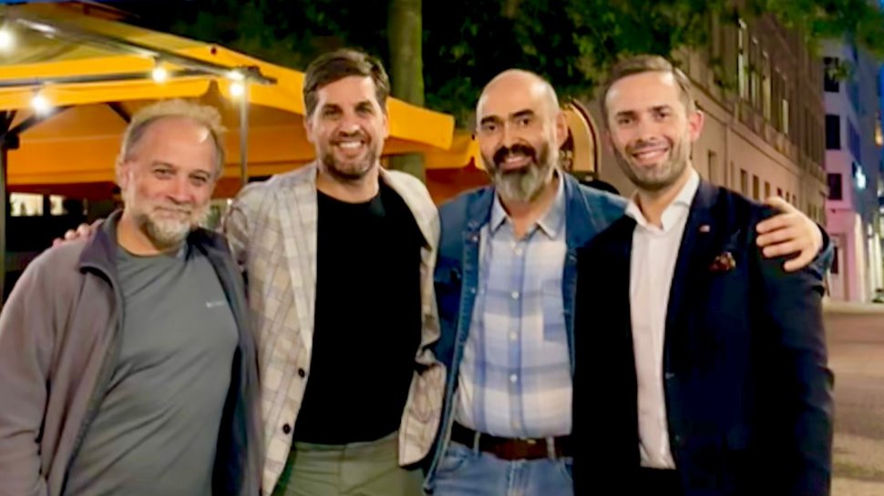 En la fotografía (izq. a der.): El académico Sergio Elórtegui, el cónyuge del cónsul general, Matías Bonaudi; el académico Fernando Venegas; y el cónsul general, Manuel José Saldías.