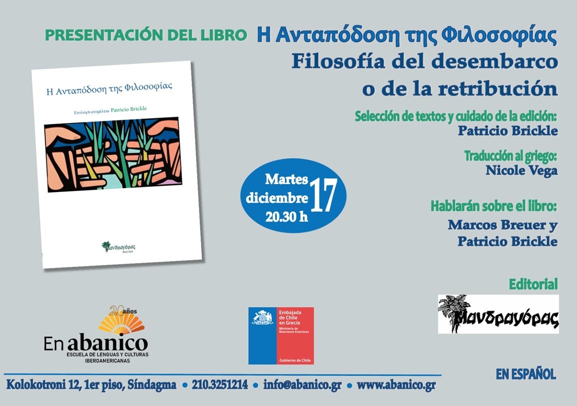 En el Centro Cultural de Lengua Española, Abanico y con el patrocinio de la Embajada de Chile en Grecia, Marcos Breuer, Doctor en Filosofía por la Universidad de Düsseldorf, Alemania, presentó el libro "Filosofía del desembarco o de la retribución", de autoría del Primer Secretario, Patricio Brickle, actual Encargado de Negocios a.i. de la Embajada de Chile en Grecia.
