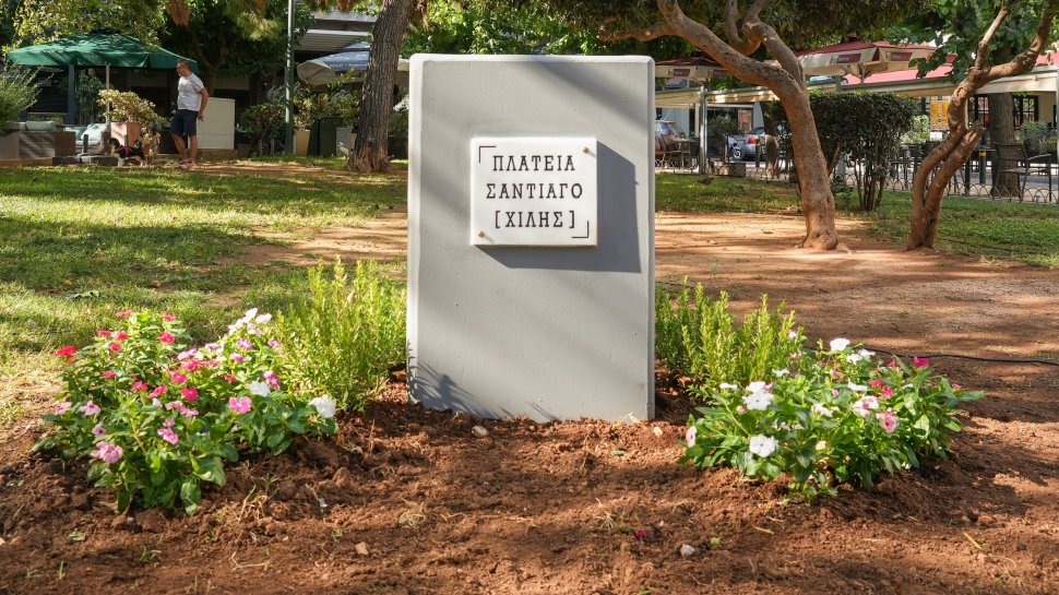 Por años la Embajada de Chile en Grecia hizo esfuerzos para que la municipalidad de Atenas reconociera el nombre de Santiago a esa plaza, algo que finalmente se concretó esta semana, con la instalación de una placa con la inscripción “Santiago (Chile)”, en el marco de las actividades de conmemoración de los 50 años del golpe de Estado.
