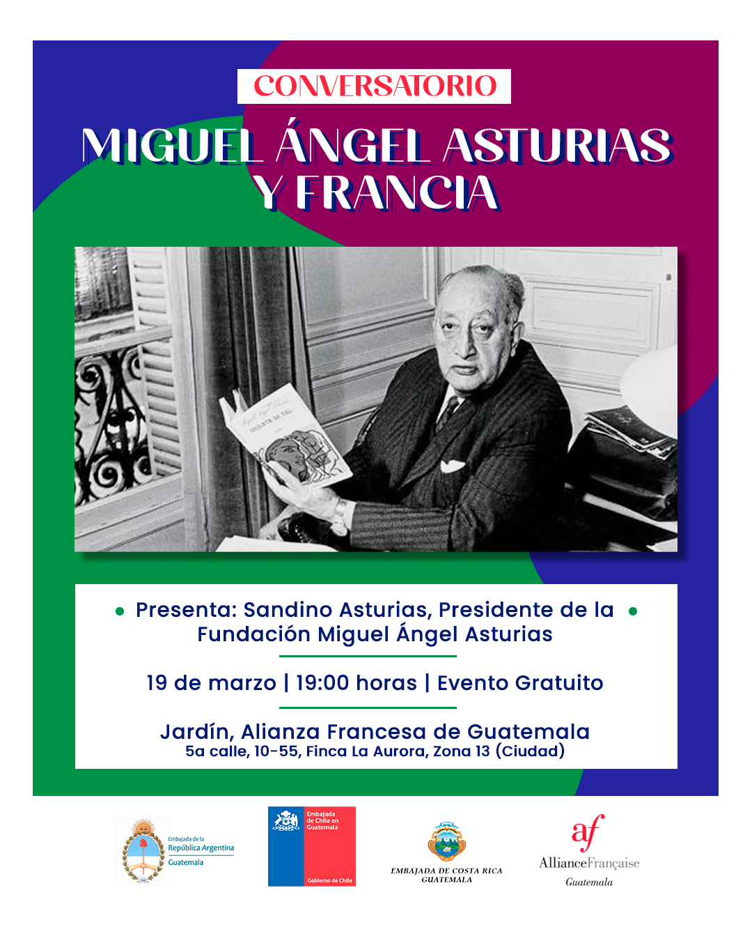 Asimismo, Chile en coordinación con las embajadas de Argentina y Costa Rica en Guatemala invitan al público en general a participar en el Conversatorio “Miguel Ángel Asturias y Francia”, a realizarse el próximo 19 de marzo a las 19:00 horas en instalaciones de la Alianza Francesa de Guatemala (5ª Calle 10-55, Finca La Aurora, Zona 13, Guatemala, Guatemala, C.A.).