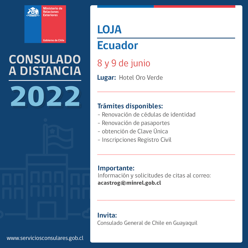 El día 8 y 9 de junio, el Consulado General de Chile en Guayaquil, realizará un consulado a distancia en la ciudad de Loja, Ecuador.