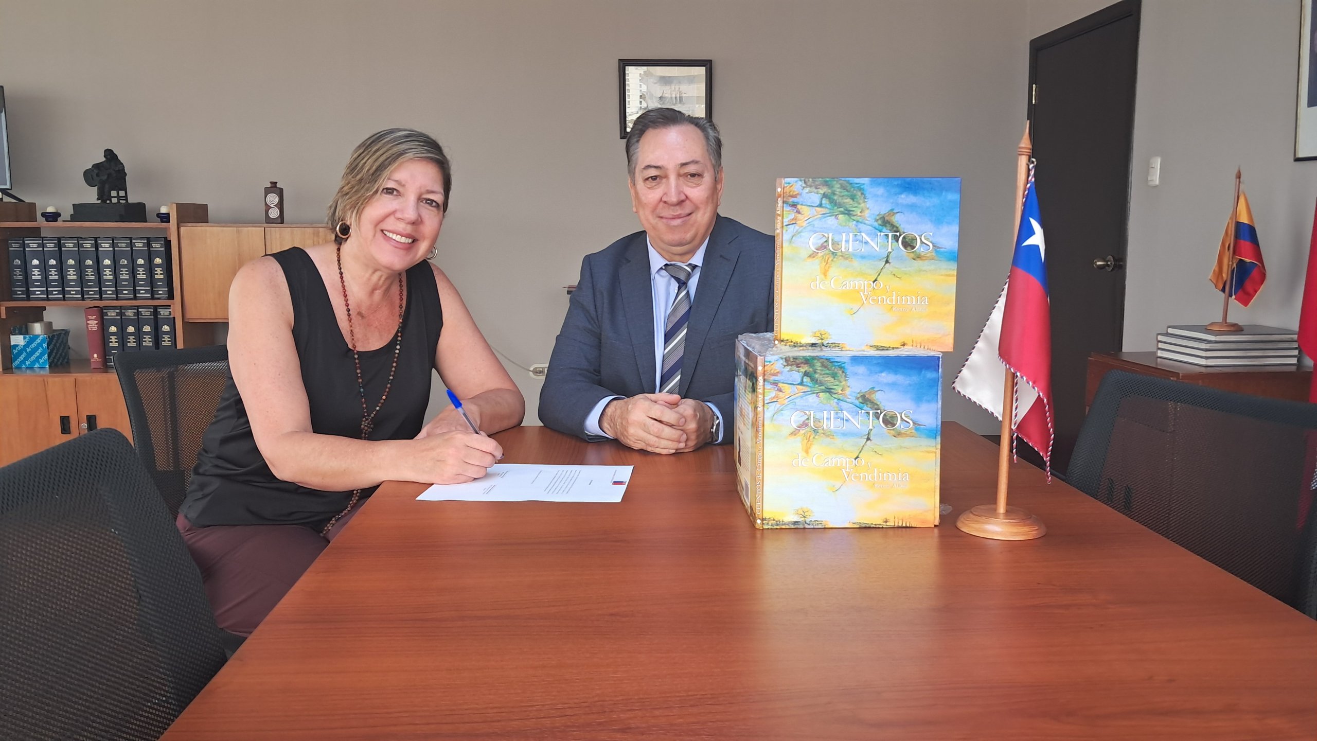 El día martes 27 de enero, la Sra. Patricia Stark, chilena residente en Guayaquil, donó al consulado, para repartir entre la comunidad chilena, 27 ejemplares del libro “Cuento de Campo y Vendimia escritos por su madre, la escritora chilena Kenny Aliaga, residente en Montreal, Canadá. En este libro la autora reúne un conjunto de cuentos del campo chileno, basado en sus recuerdos y vivencias.
