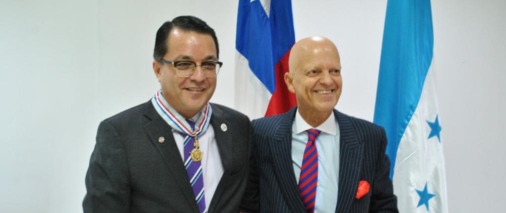 Este miércoles 17 de noviembre, el Embajador de Chile, Enrique Barriga, impuso al Rector de la Universidad Tecnológica Centroamericana (UNITEC), Marlon Brevé, la Condecoración Orden al Mérito Docente y Cultural Gabriela Mistral” en el Grado de Comendador, por sus valiosos apoyos y servicios brindados desde la academia en actividades de difusión de la cultura chilena en Honduras.