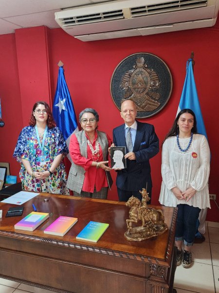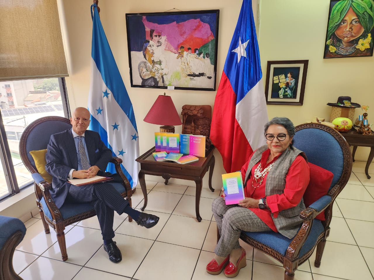 El Embajador de Chile Enrique Barriga se reunió con la Ministra de las Culturas, las Artes y los Patrimonios de los Pueblos de Honduras, Anarella Vélez, oportunidad que hizo entrega de diverso material literario entre estos, 50 ejemplares del libro “Veinticinco Voces Poéticas de Centroamérica, Homenaje de Chile al Bicentenario de la Independencia de Centroamérica”.