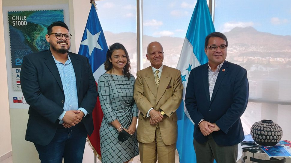 En su visita a la Embajada de Chile, oportunidad que fueron recibidos por el Embajador Enrique Barriga, fueron acompañados por el Rector de la Universidad Tecnológica Centroamericana (UNITEC), Marlon Breve y la Directora de Proyectos Tecnológicos de esa Casa de Estudios, Gabriela Torres.