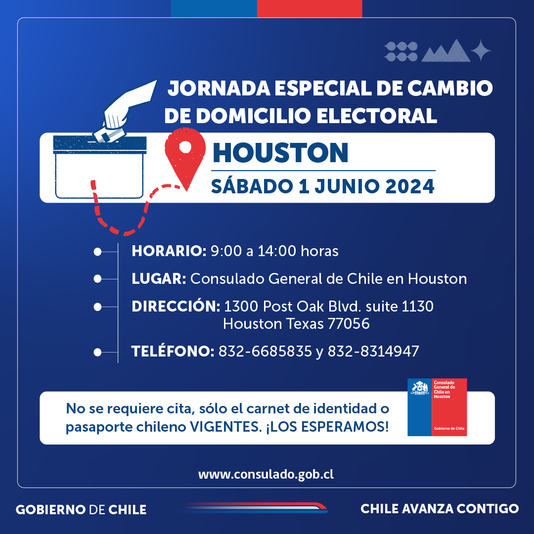 El 8 de junio vence el plazo para actualizar el Registro Electoral y en ese contexto el Consulado General de Chile en Houston organizó una jornada extraordinaria de atención exclusiva de solicitudes de cambio de domicilio electoral, para el sábado 1 de junio, entre las 9:00 y las 14:00 horas, en sus dependencias.