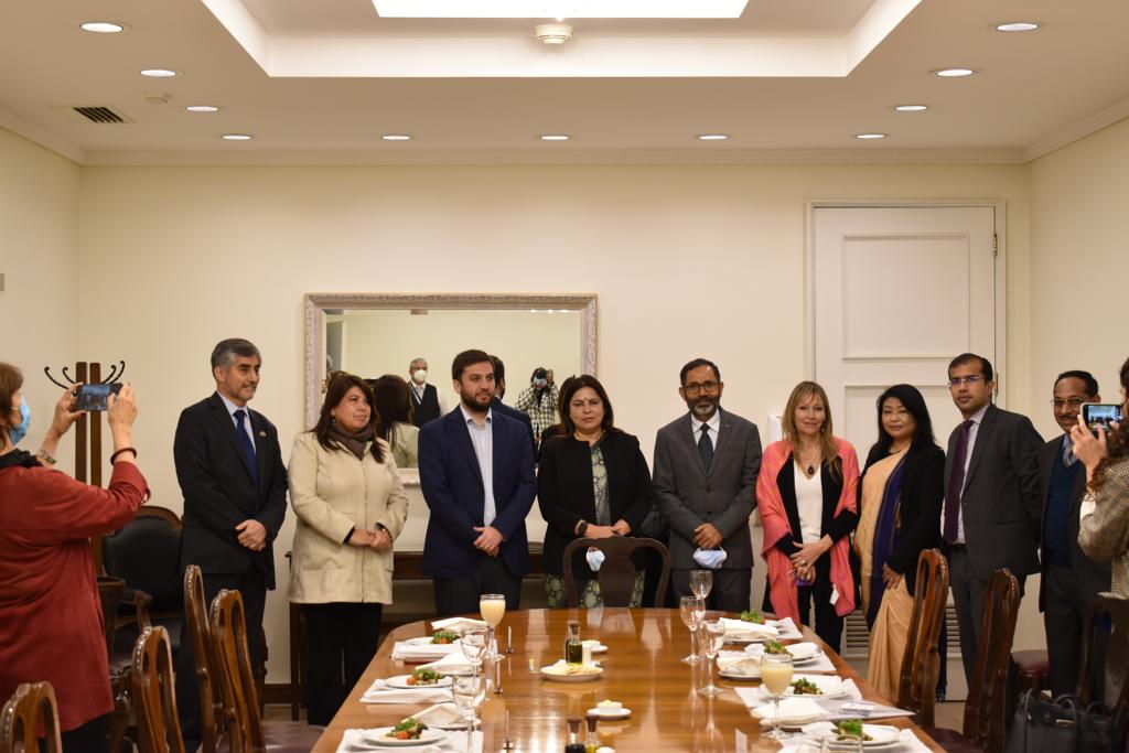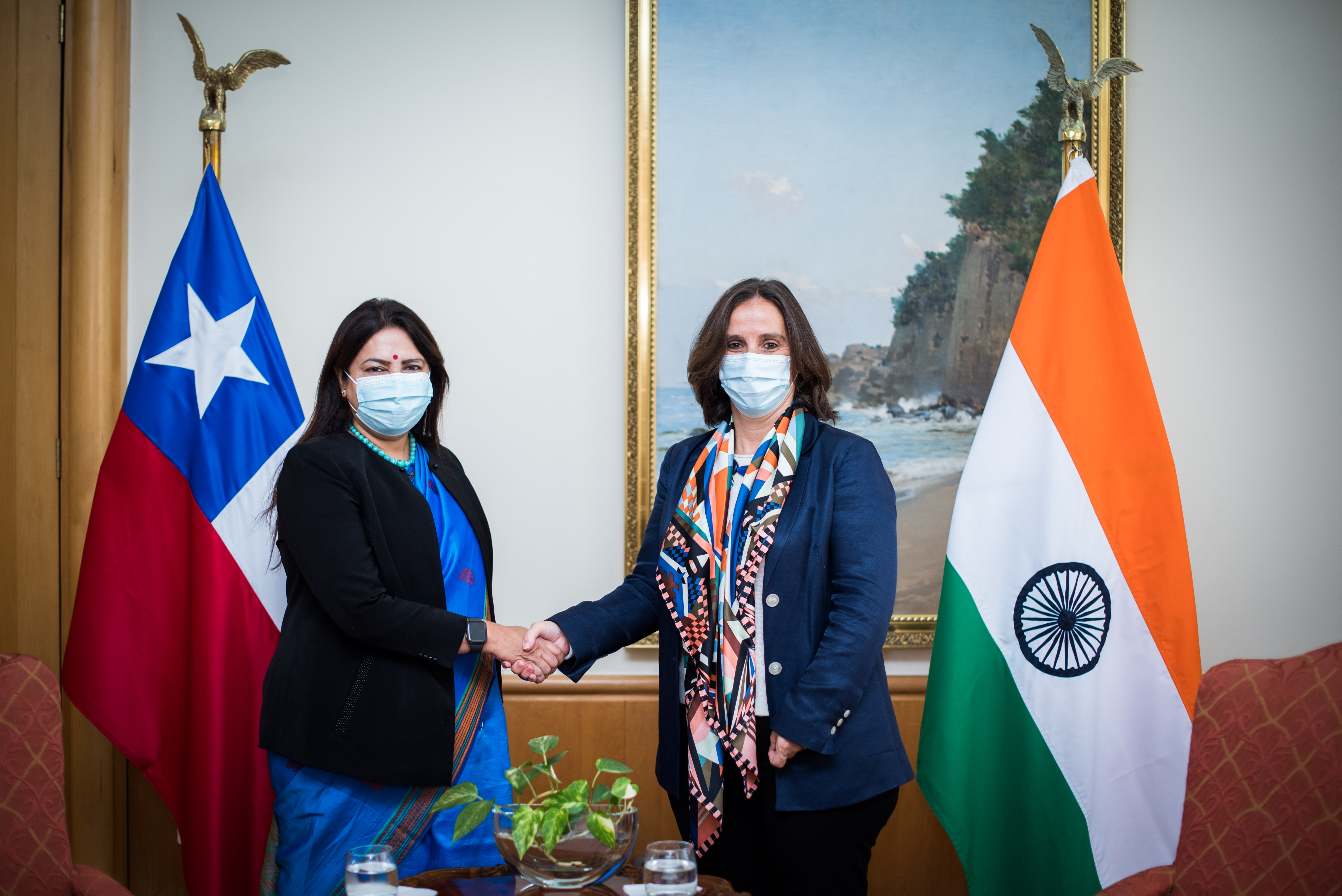 Como parte de la agenda de la visita, la Ministra Lekhi se reunió con la Canciller de Chile, Antonia Urrejola, donde ambas autoridades revisaron varios documentos que se encuentran en negociación, expresando el interés mutuo de seguir profundizando los vínculos bilaterales.