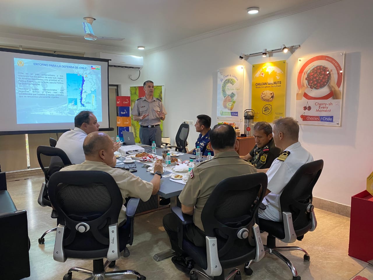 El agregado de Defensa, Militar, Naval y Aéreo de Chile en India, Coronel Leonardo Palma González llevó a cabo una presentación de la Política de Defensa de Chile y sobre las Fuerzas Armadas del país, que se llevó a cabo el 21 de junio en dependencias de la embajada de Chile.