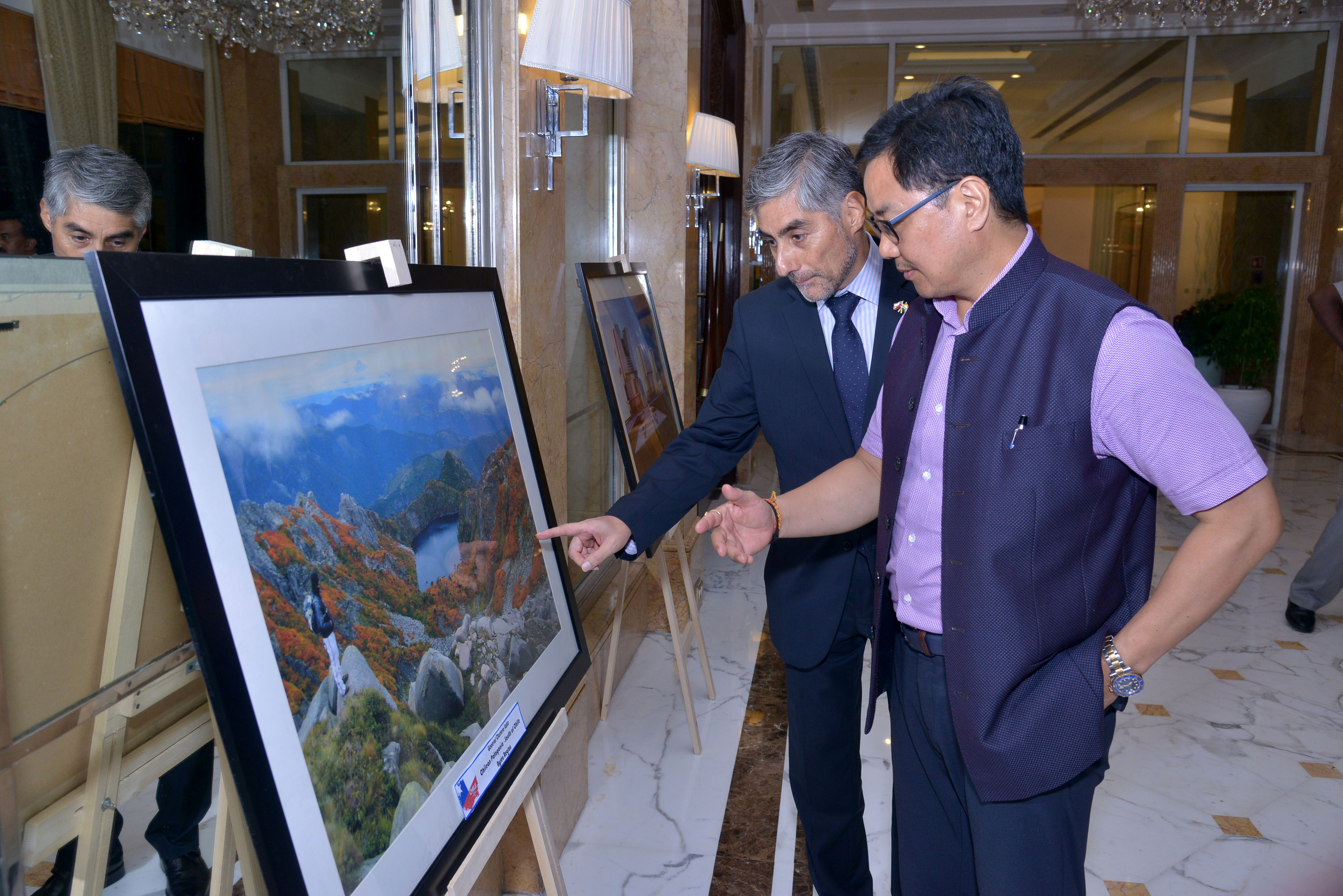![]() Ministro Rijiju observa parte de la muestra fotográfica.