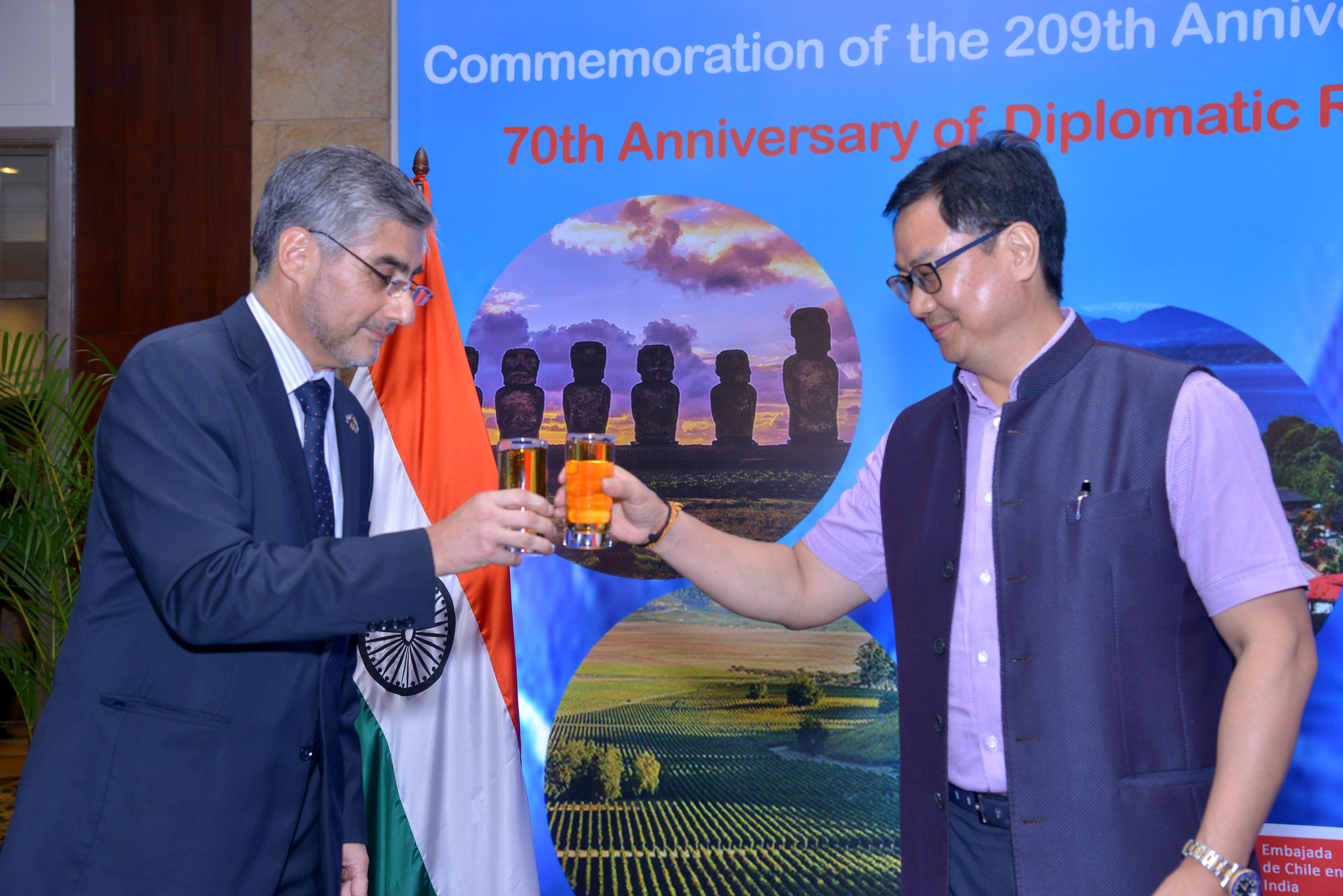 El miércoles 25 de septiembre, se conmemoró en Nueva Delhi, el 209º aniversario del inicio del proceso de Independencia de Chile, con una recepción ofrecida por el Embajador Juan Angulo a autoridades indias, cuerpo diplomático residente, dirigentes de organizaciones empresariales, empresarios, representantes del mundo académico y cultural, y miembros de la colonia chilena. El invitado de honor para la ocasión fue el Ministro de Estado (independiente) para la Juventud y los Deportes, Kiren Rijiju.