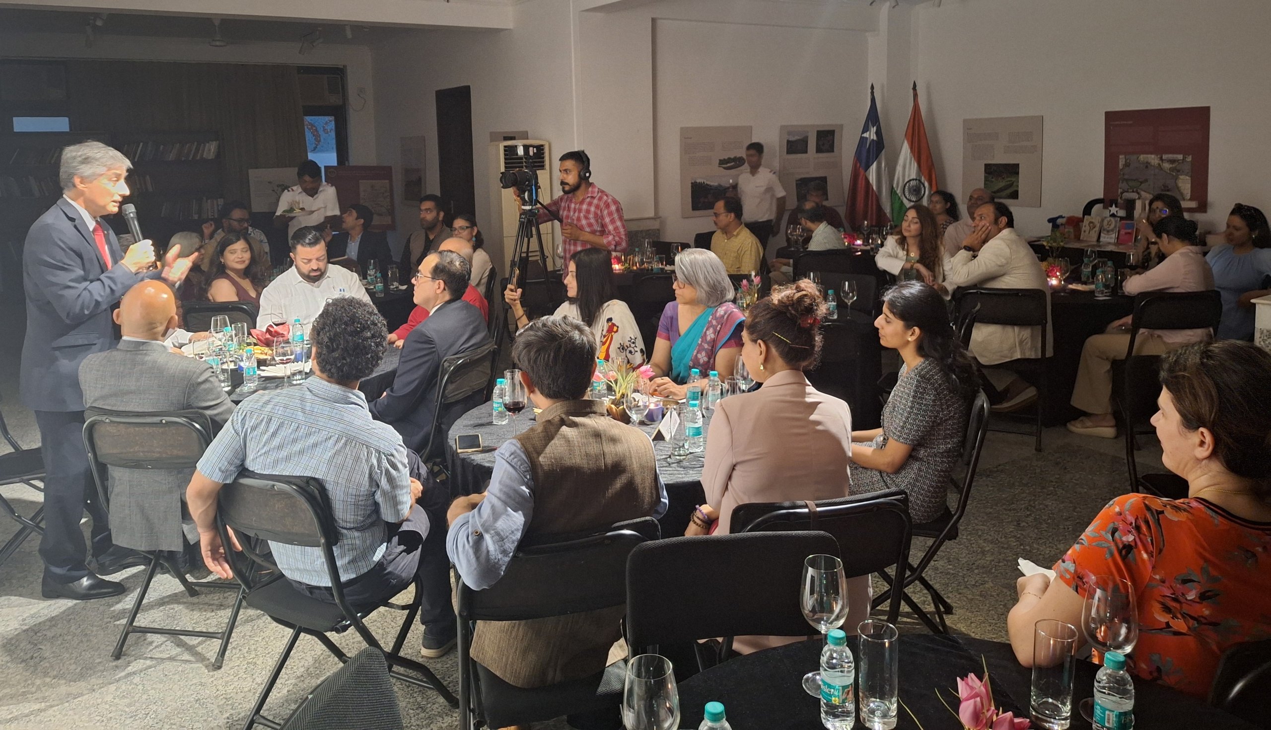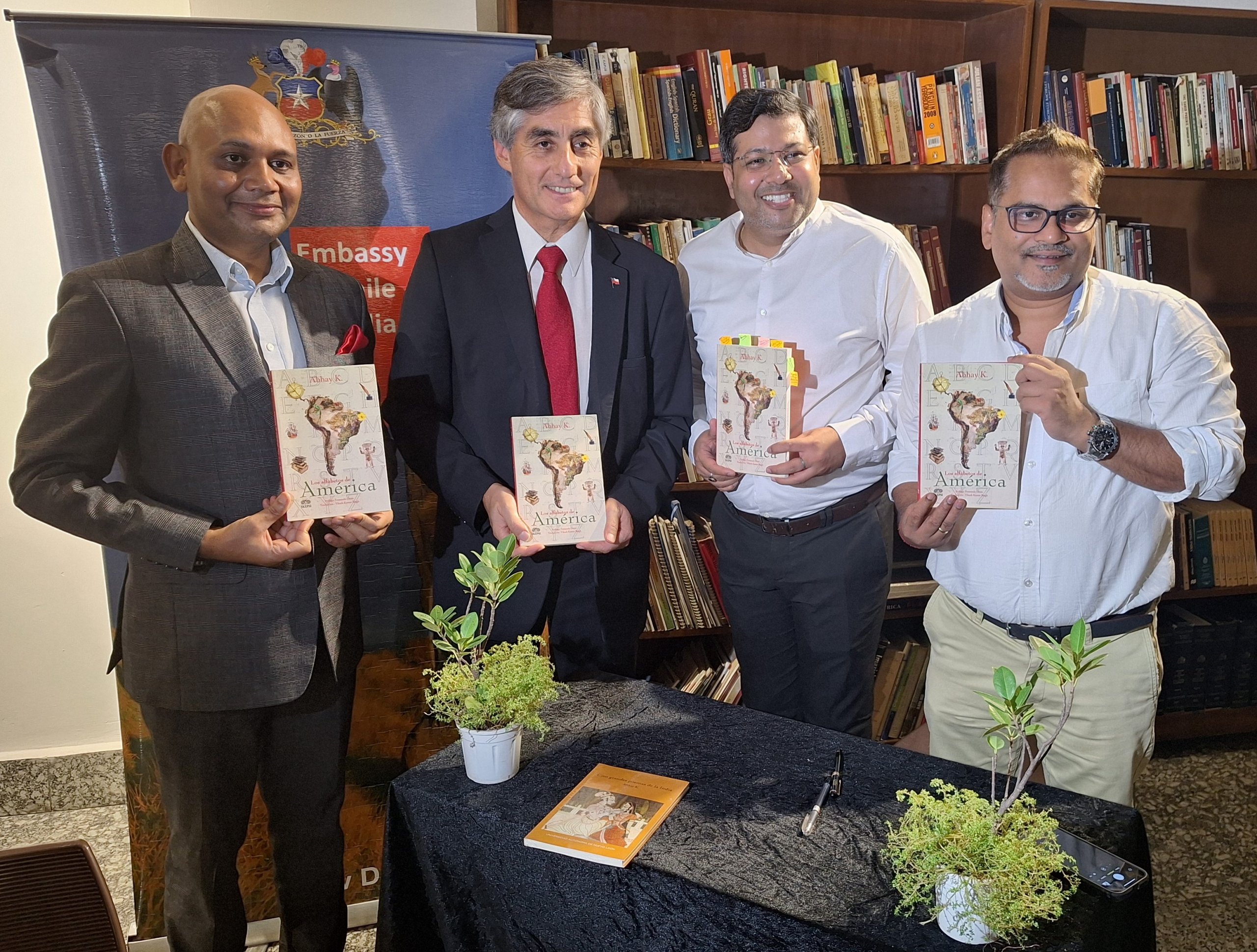 En dependencias de la embajada de Chile en India se realizó una exitosa sesión literaria en torno al libro del reconocido poeta y diplomático indio, Abhay Kumar, titulado originalmente “The Alphabets of Latin America” (Bloomsbury India, 2020). Su traducción al castellano, titulada “Los alfabetos de América Latina” (Sképsi, 2025), fue realizada por el académico de la Universidad de Delhi, Vikash Kumar Singh, quien también asistió al evento.