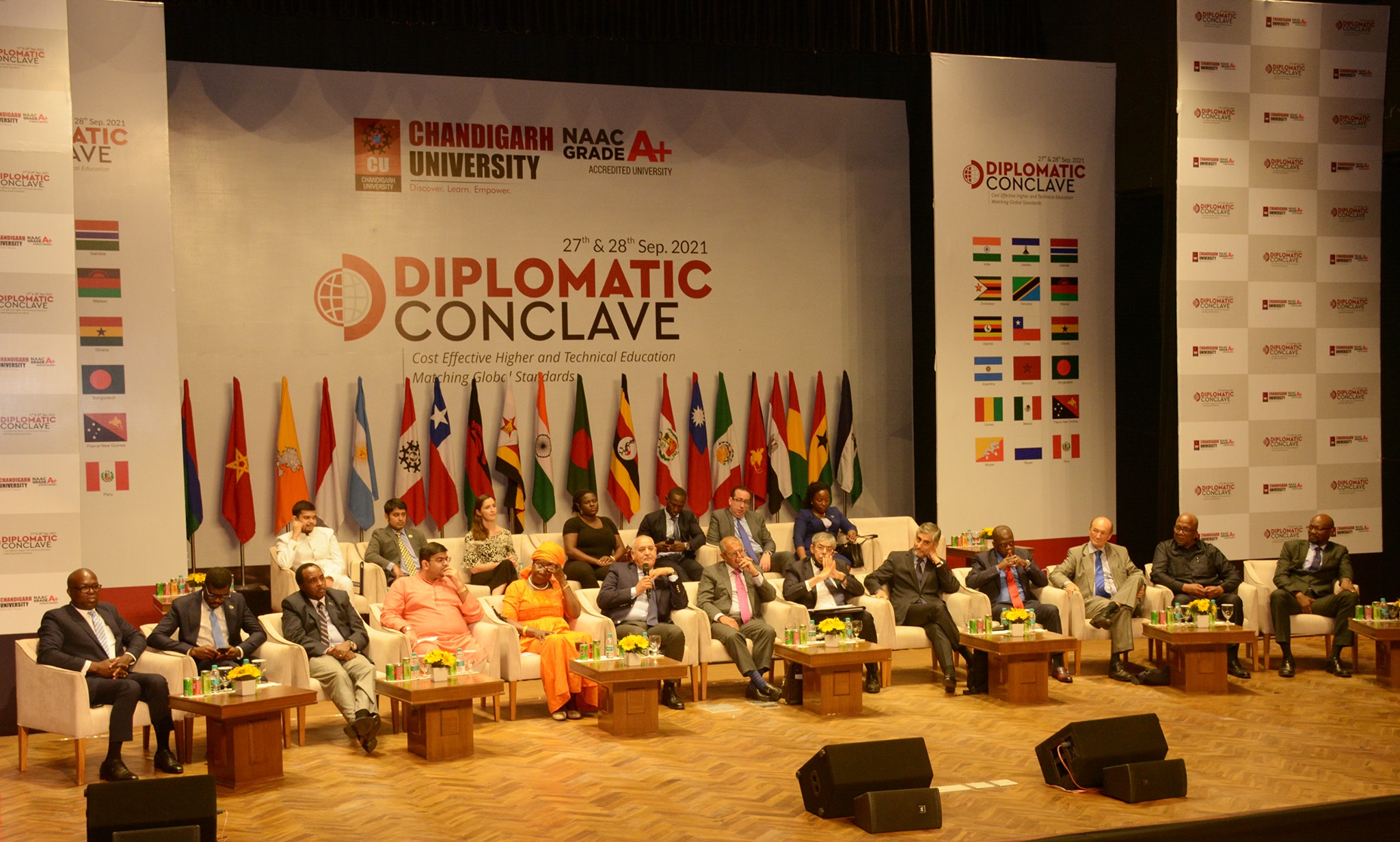 Los días 27 y 28 de septiembre, el Embajador Juan Angulo participó, en compañía de la Tercera Secretaria Amaranta Vandeperre, del primer Cónclave Diplomático organizado por la Universidad de Chandigarh, en Punjab. La actividad tuvo por objetivo visibilizar el potencial de la movilidad estudiantil y contó con la participación virtual del Ministro de Estado de Asuntos Exteriores, V. Muraleedharan, y presencial del Director del Indian Council for Cultural Relations (ICCR), Embajador Dinesh Patnaik, además de Jefes de Misión y de Cancillería de 15 Embajadas presentes en India.