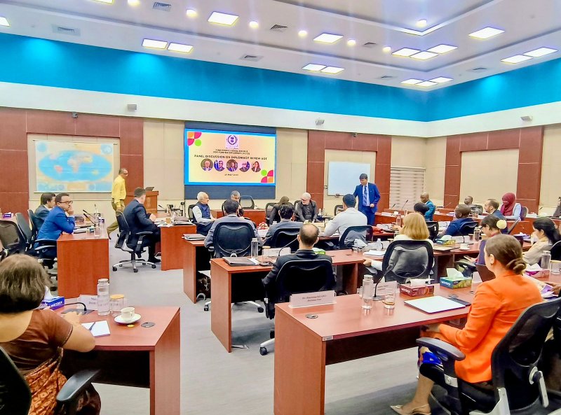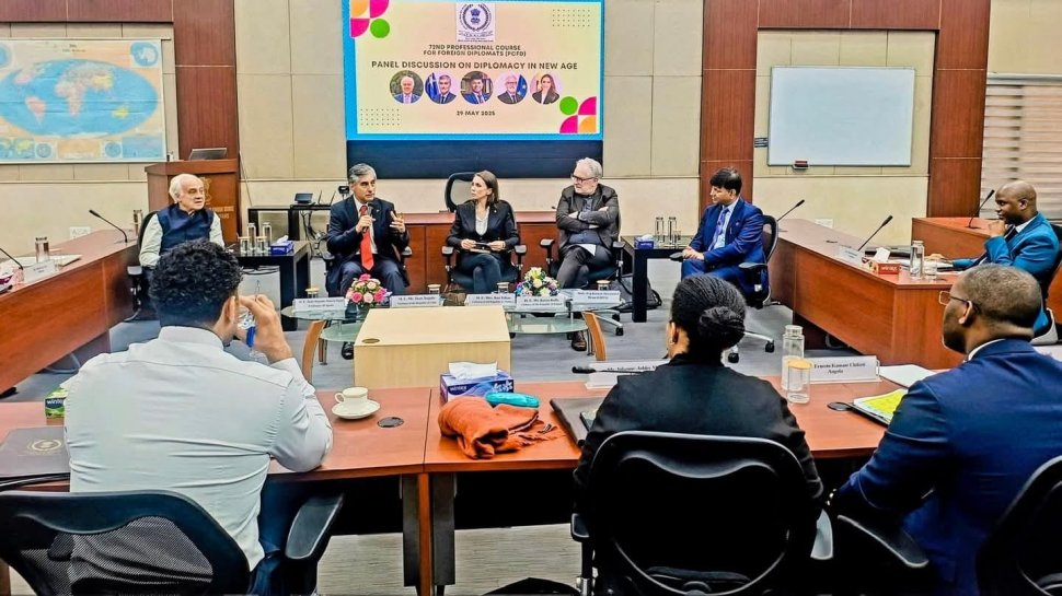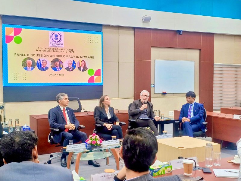 El pasado 29 de mayo, en el marco del 72° Curso Profesional para Diplomáticos Extranjeros (PCFD) organizado por la Sushma Swaraj Indian Institute of Foreign Service (Ssifs) de India, el embajador Juan Angulo fue invitado a participar del conversatorio titulado “New Age Diplomacy”, junto a sus homólogos de España, Irlanda y Moldavia. El encuentro, moderado por el decano del Ssifs, reunió a 28 jóvenes diplomáticos de diversas regiones del mundo, quienes forman parte del curso, y ofreció un espacio privilegiado para el intercambio de ideas sobre los desafíos contemporáneos de la diplomacia.