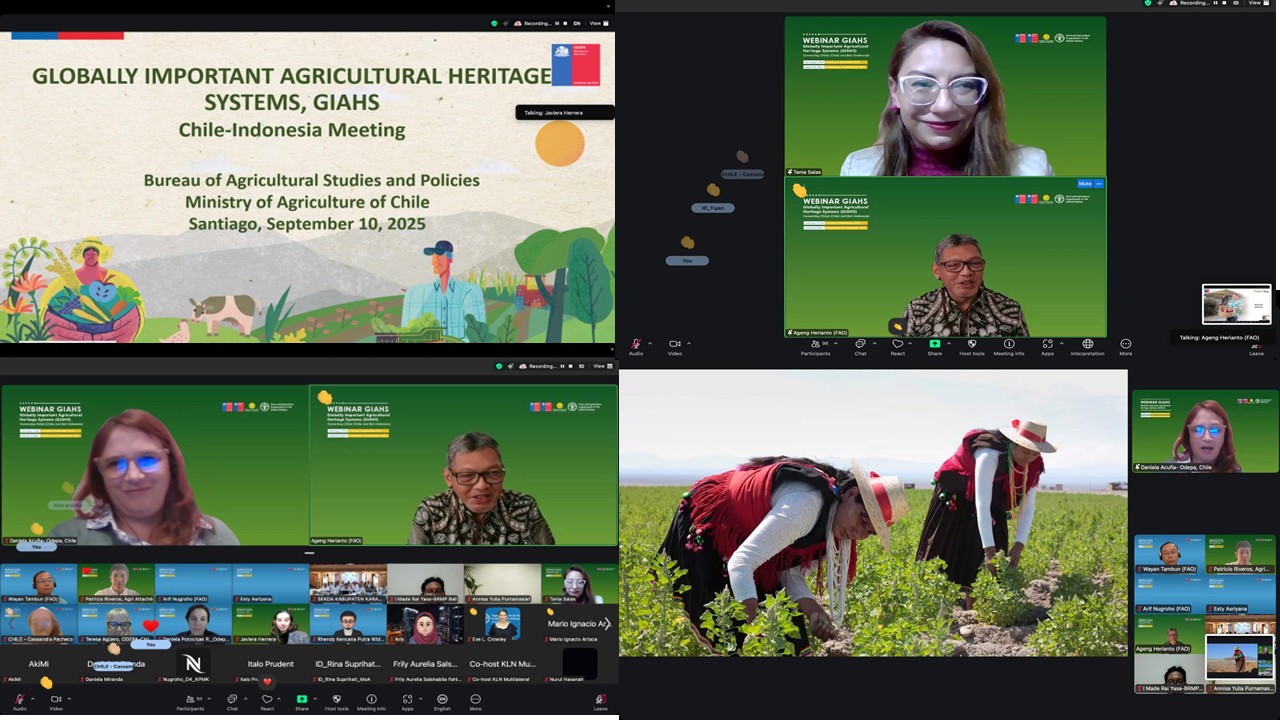 En el marco de la conmemoración de los 60 años de relaciones diplomáticas entre Chile e Indonesia, se desarrolló el webinar “Conectando Sistemas Importantes del Patrimonio Agrícola Mundial de Chile e Indonesia, Chiloé y Bali”, en el que participaron 175 asistentes, tanto de Chile como de Indonesia, entre ellos, representantes del ámbito gubernamental nacional, regional y local, académicos, productores, estudiantes y organismos internacionales, entre otros, para compartir experiencias y fortalecer la cooperación en gestión, promoción y conservación del patrimonio agrícola nacional y global.