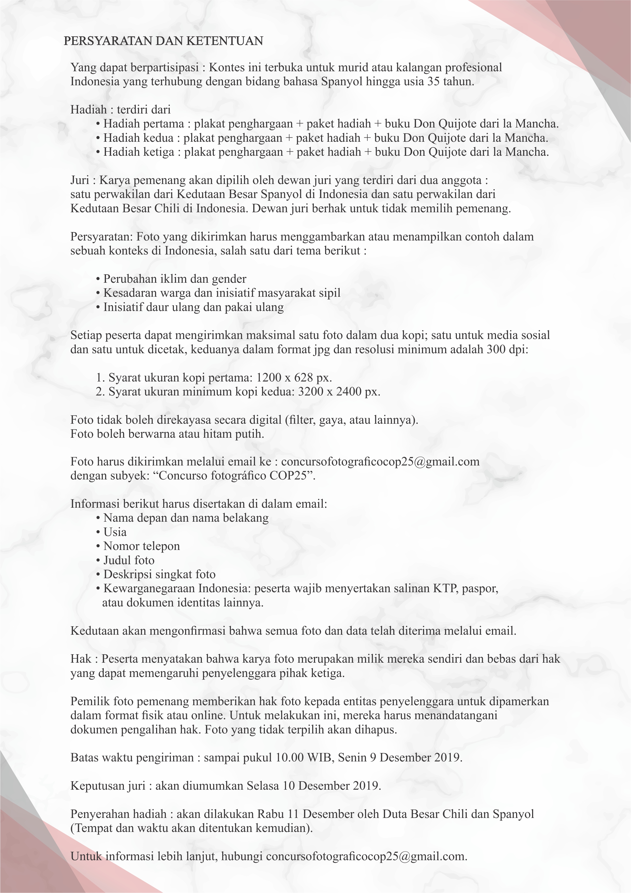En el contexto de la realización de la Conferencia de la ONU sobre el Cambio Climático, COP25, entre los días 2 y 13 de diciembre próximo, en Madrid, España, bajo la Presidencia de Chile, las Embajadas de Chile y España en Indonesia junto al Instituto Cervantes en Yakarta invitan a participar en el concurso de fotografía organizado por la ocasión.