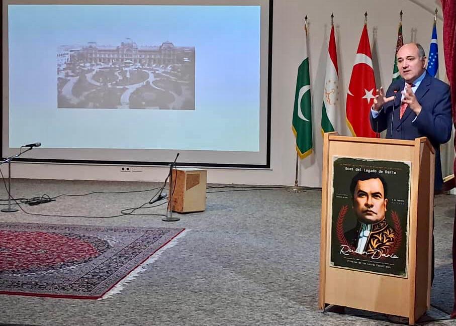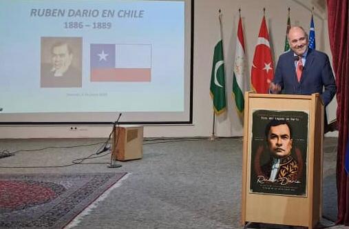 En esta oportunidad, el encargado de negocios de Chile expuso sobre la vida del poeta en Chile, entre 1886 y 1889, período en que escribió una de sus obras más sublimes “Azul…”, publicada por primera vez en Valparaíso en 1888. Esta obra es considerada la inauguración del “modernismo literario en Iberoamérica”, provocando un cambio de estilo en el romanticismo, el simbolismo y el parnasianismo. También recordó los homenajes al poeta y la estatua que lleva su nombre localizado en el Parque Forestal de Santiago.