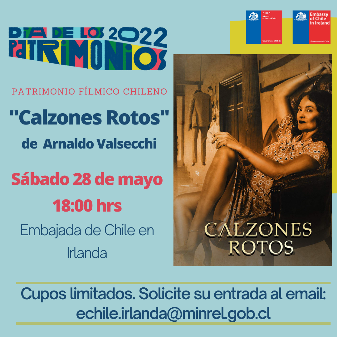 La Embajada de Chile en Irlanda exhibirá, de forma gratuita, la película "Calzones Rotos" (2018) de Arnaldo Valsecchi el sábado 28 de mayo a las 18:00. Es posible contar con este film gracias a la generosidad de la Productora Valcine S.A. y la Dirección de Asuntos Culturales del Ministerio de Relaciones Exteriores, DIRAC.