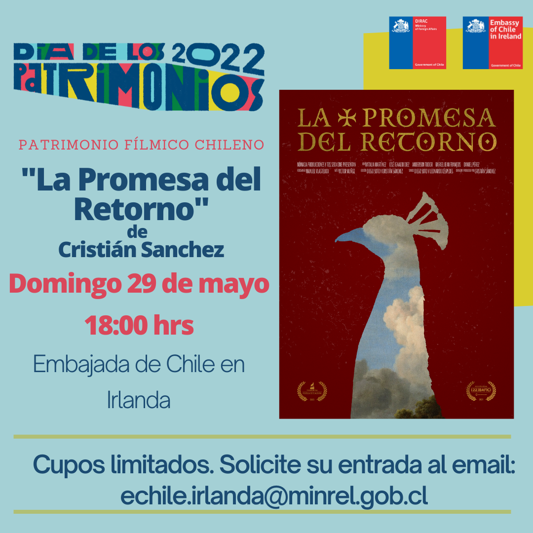 La Embajada de Chile en Irlanda presentará, de forma gratuita, la película “La Promesa del Retorno” (2020) de Cristián Sánchez el domingo 29/05 a las 18:00. La exhibición es posible gracias a Nómada Producciones y la Dirección de Asuntos Culturales del Ministerio de Relaciones Exteriores, DIRAC.