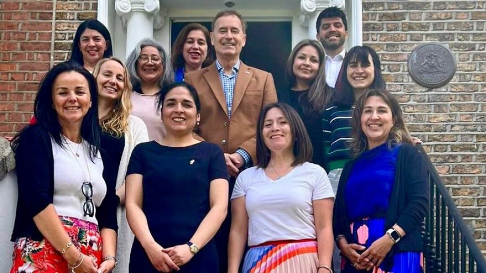 El embajador Ricardo Hernández y el cónsul Pablo Solar se reunieron con un grupo de chilenas residentes en Irlanda para exponer y dialogar sobre la Política Exterior Feminista (PEF) del Ministerio de Relaciones Exteriores de nuestro país.