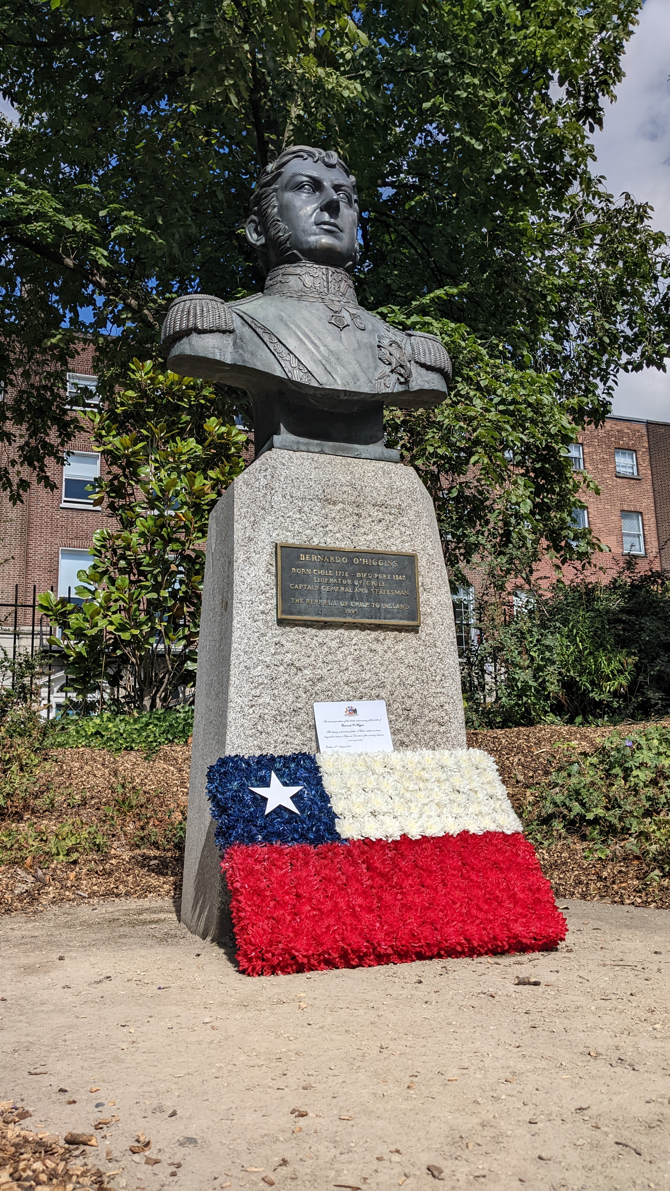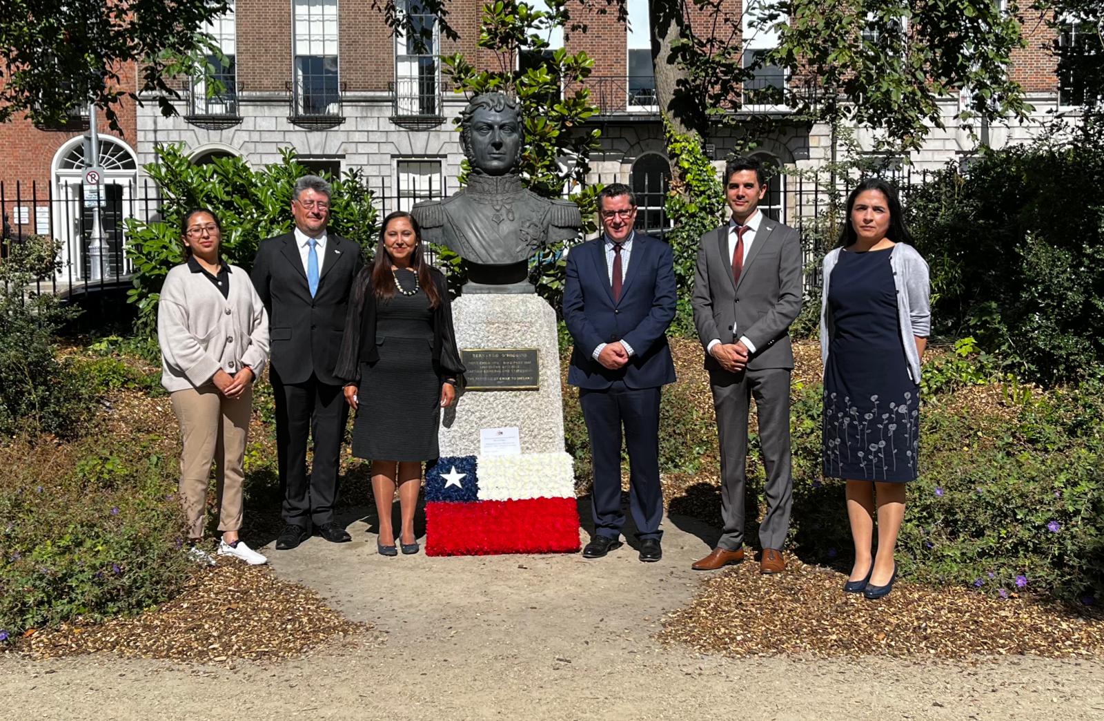 La Embajada de Chile en Irlanda, con motivo del 244° aniversario del natalicio del Libertador Bernardo O'Higgins, depositó el pasado 22 de agosto, una ofrenda floral en el busto del Padre de la Patria, ubicado en Dublín, en el céntrico parque de Merrion Square.