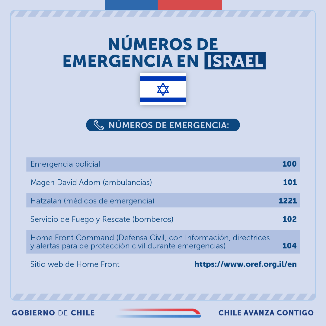 Finalmente, ante cualquier situación de emergencia o inseguridad a la que se puedan ver enfrentados, se recuerda que pueden comunicarse, durante las 24 horas del día, al teléfono de emergencias consulares del Consulado +972 54 6507255 o al correo electrónico telaviv@consulado.