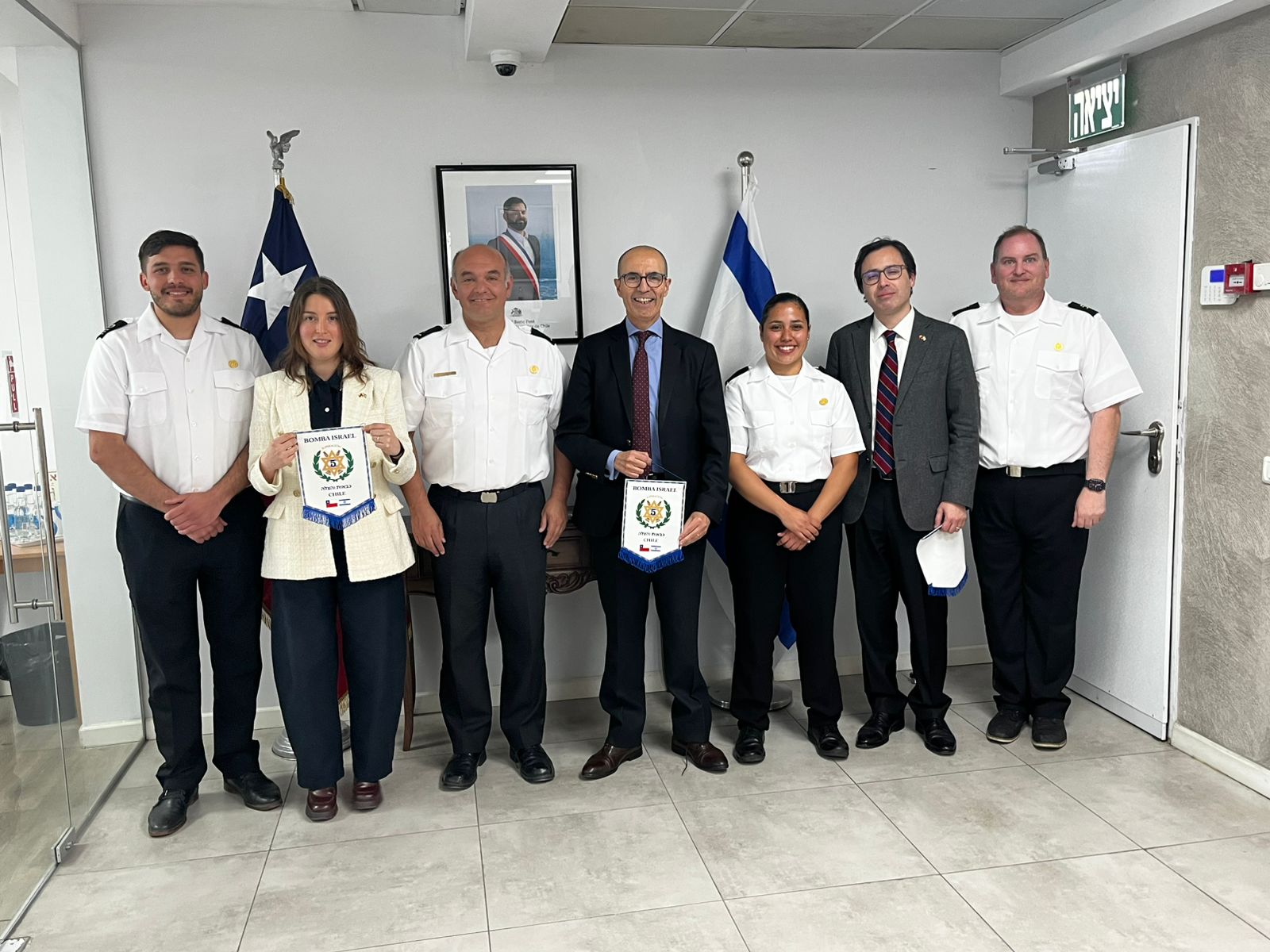 El jefe de misión de la Embajada de Chile en Israel, ministro consejero, Patricio Cifuentes, acompañado de los diplomáticos de la embajada, recibió a una delegación de la Quinta Compañía del Cuerpo de Bomberos de Ñuñoa denominada "Israel”, a cargo de su director, David Schueftan, en el marco de una visita de capacitación realizada en el país.